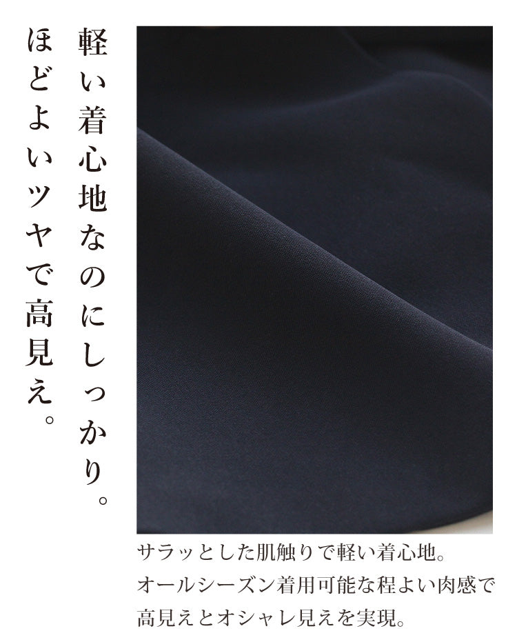 上質な光沢ととろみのあるサテン生地とストレッチ性のあるカットソー生地のドッキングデザイン。
