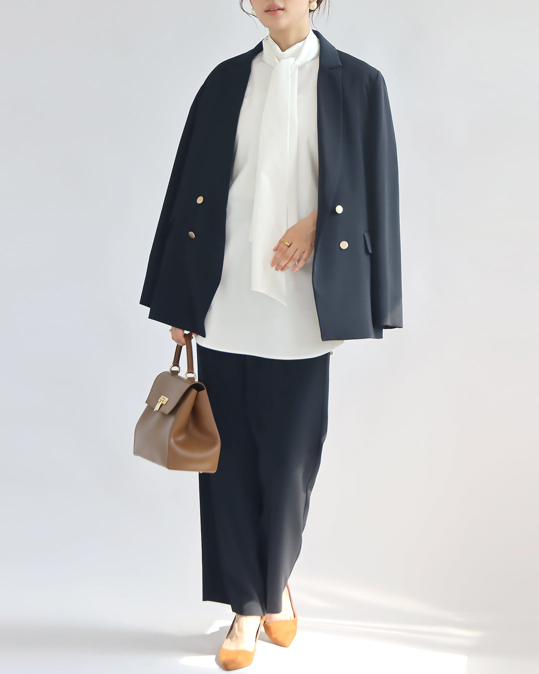 ストレートに落ちるシルエットにシャープな襟もと、ダブルのボタンが演出する