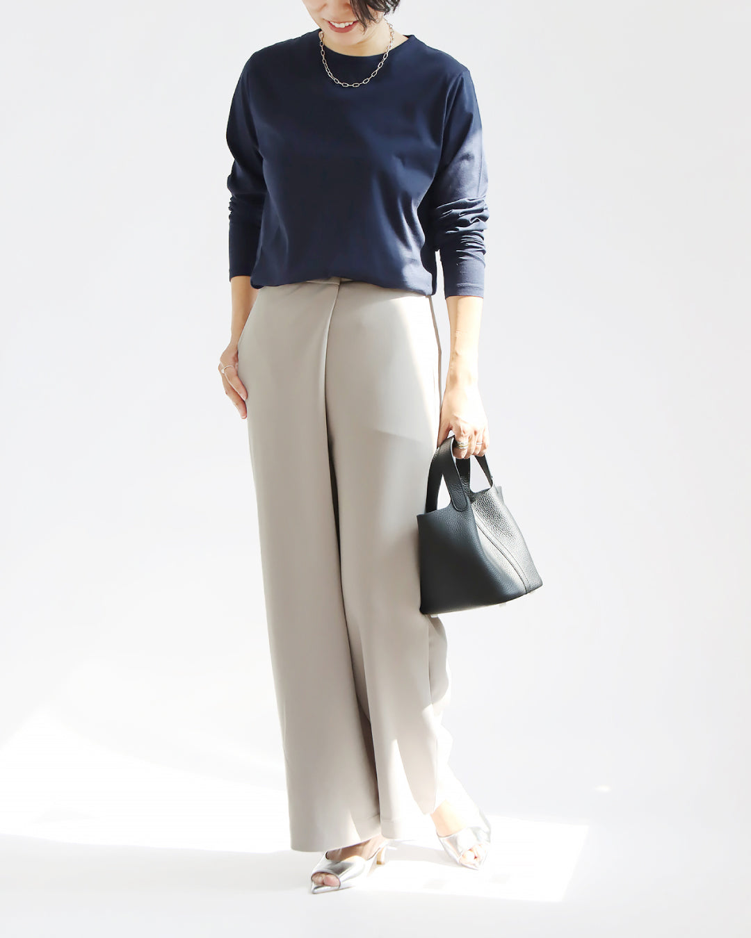 上品さを出したい日はグレージュのパンツが◎学校行事には