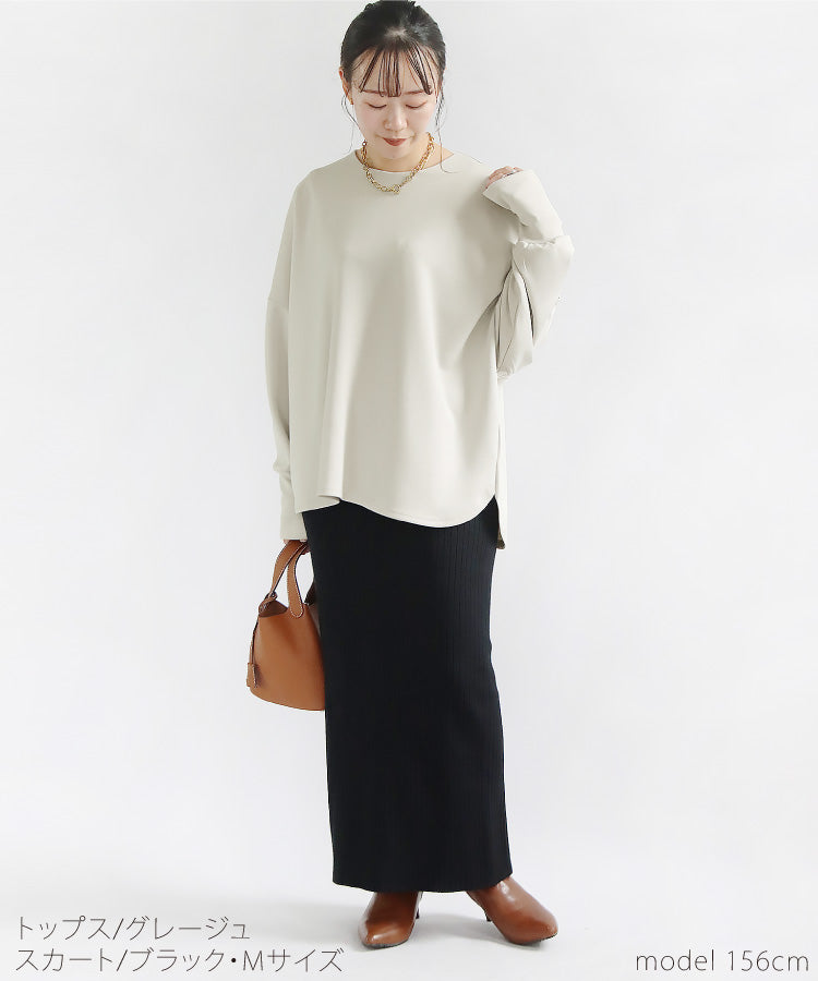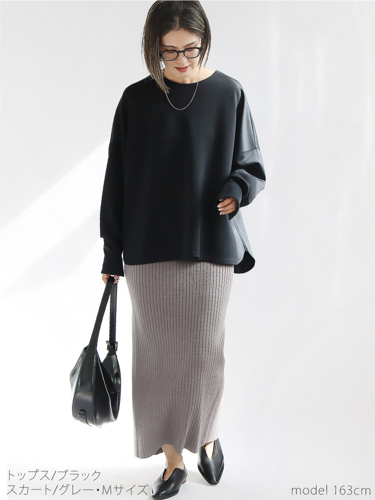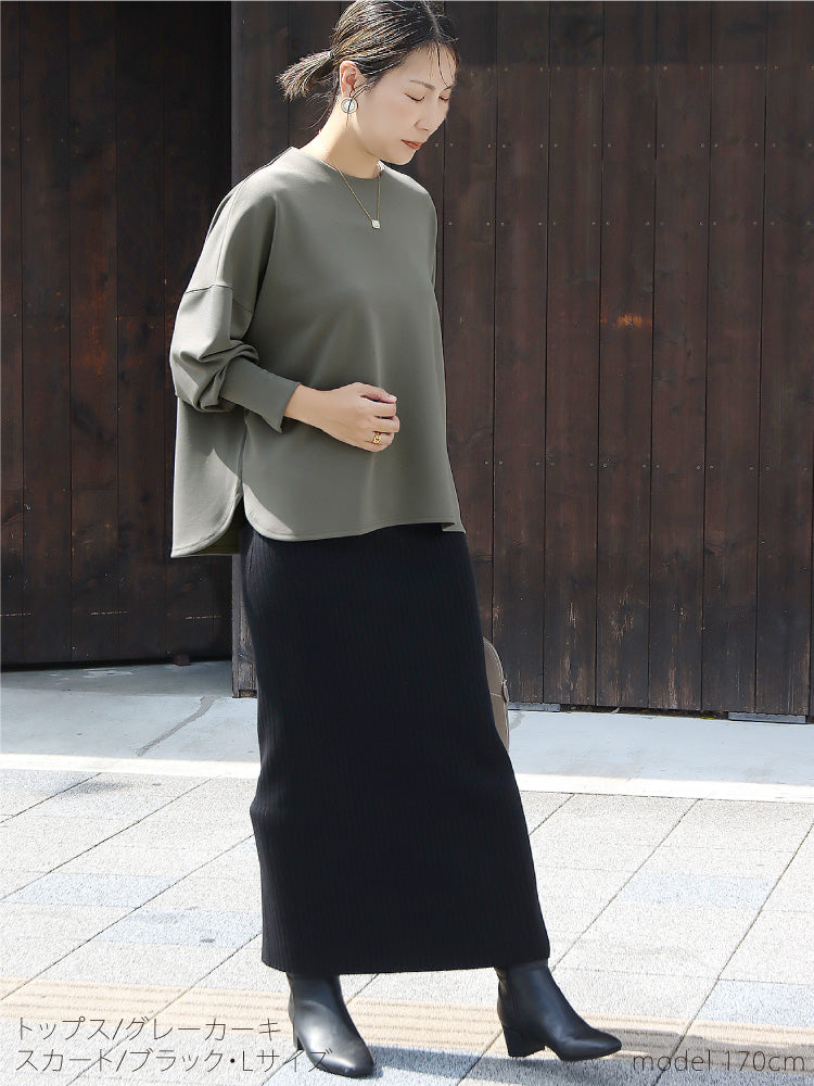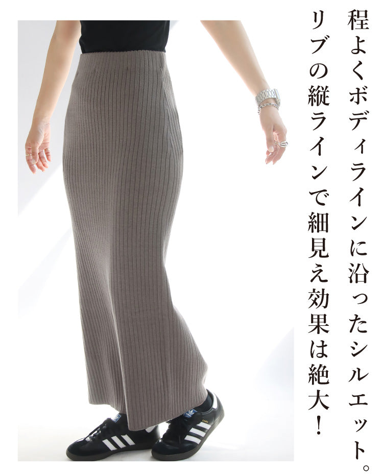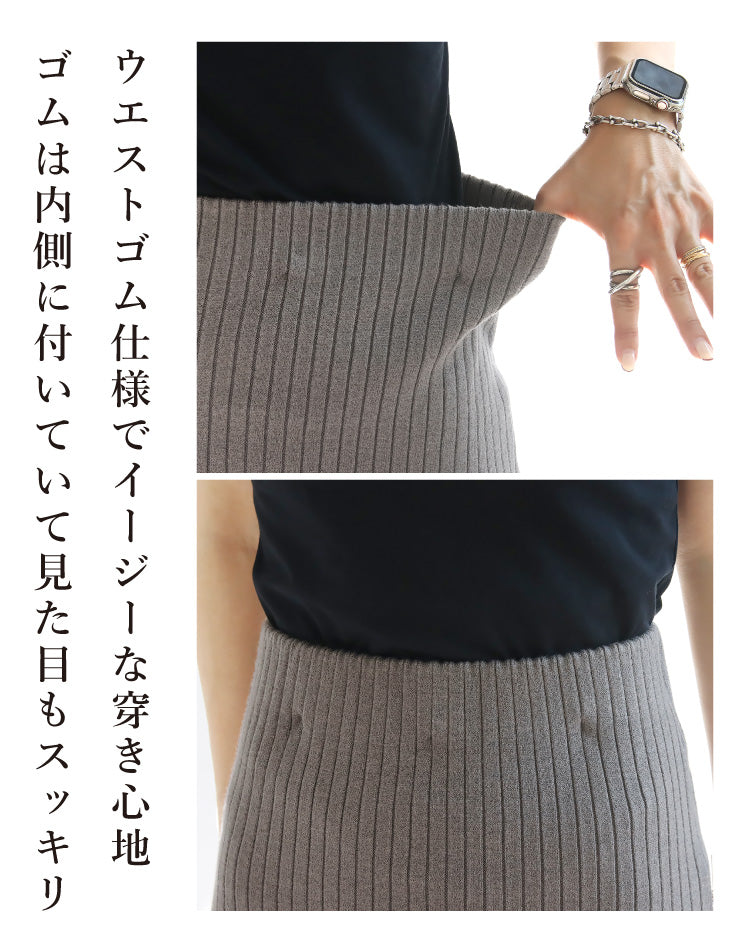 リブの縦ラインで細身絵効果も◎。ウエストゴム仕様でラクな着心地と上品さを兼ね備えたスカートです。