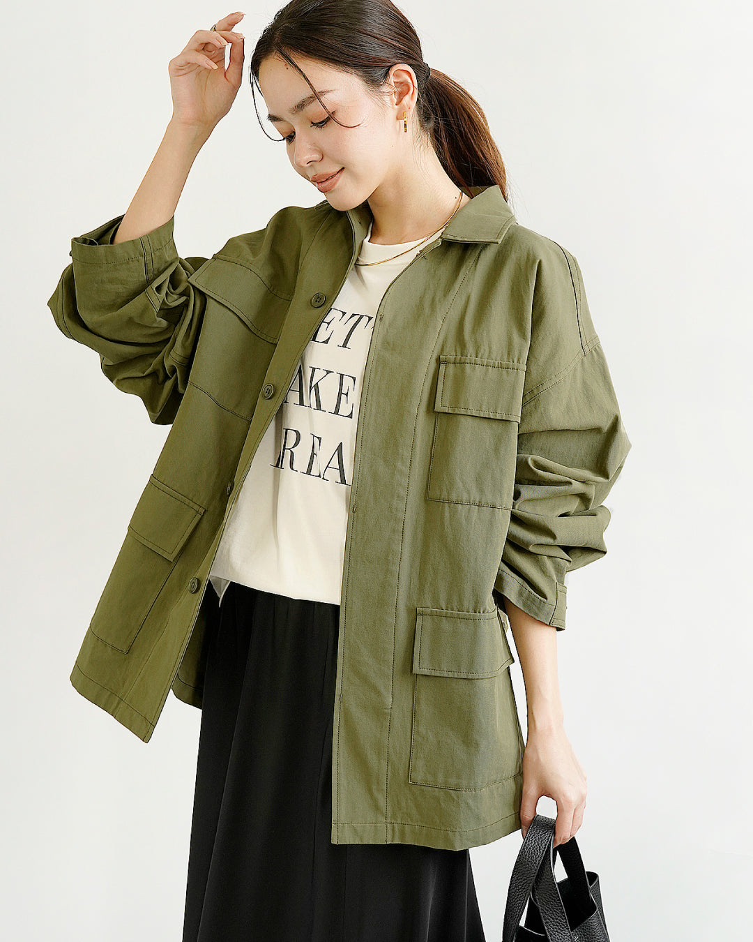 カーキのジャケットにスカートを合わせた甘辛ミックス