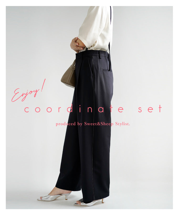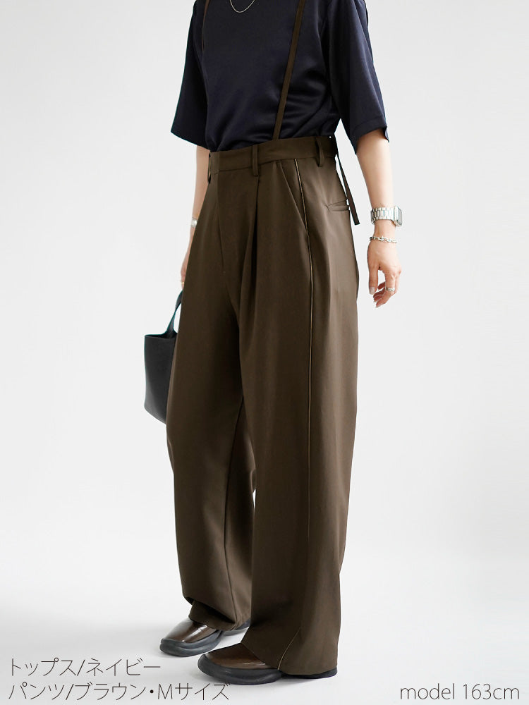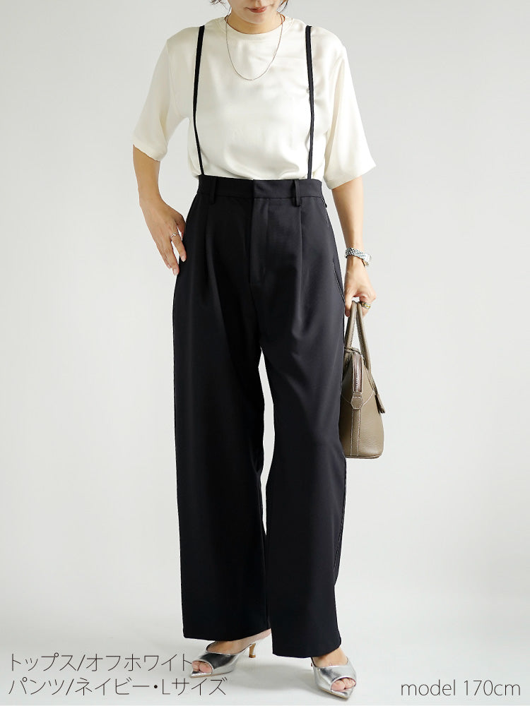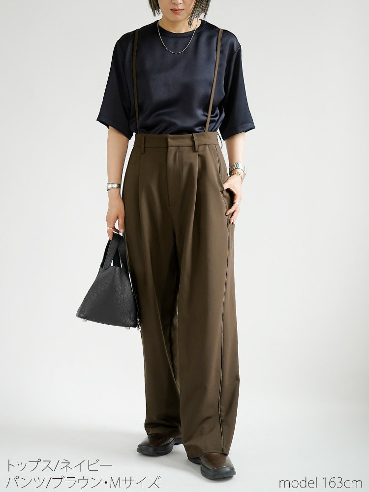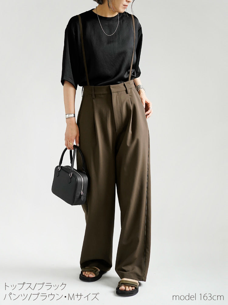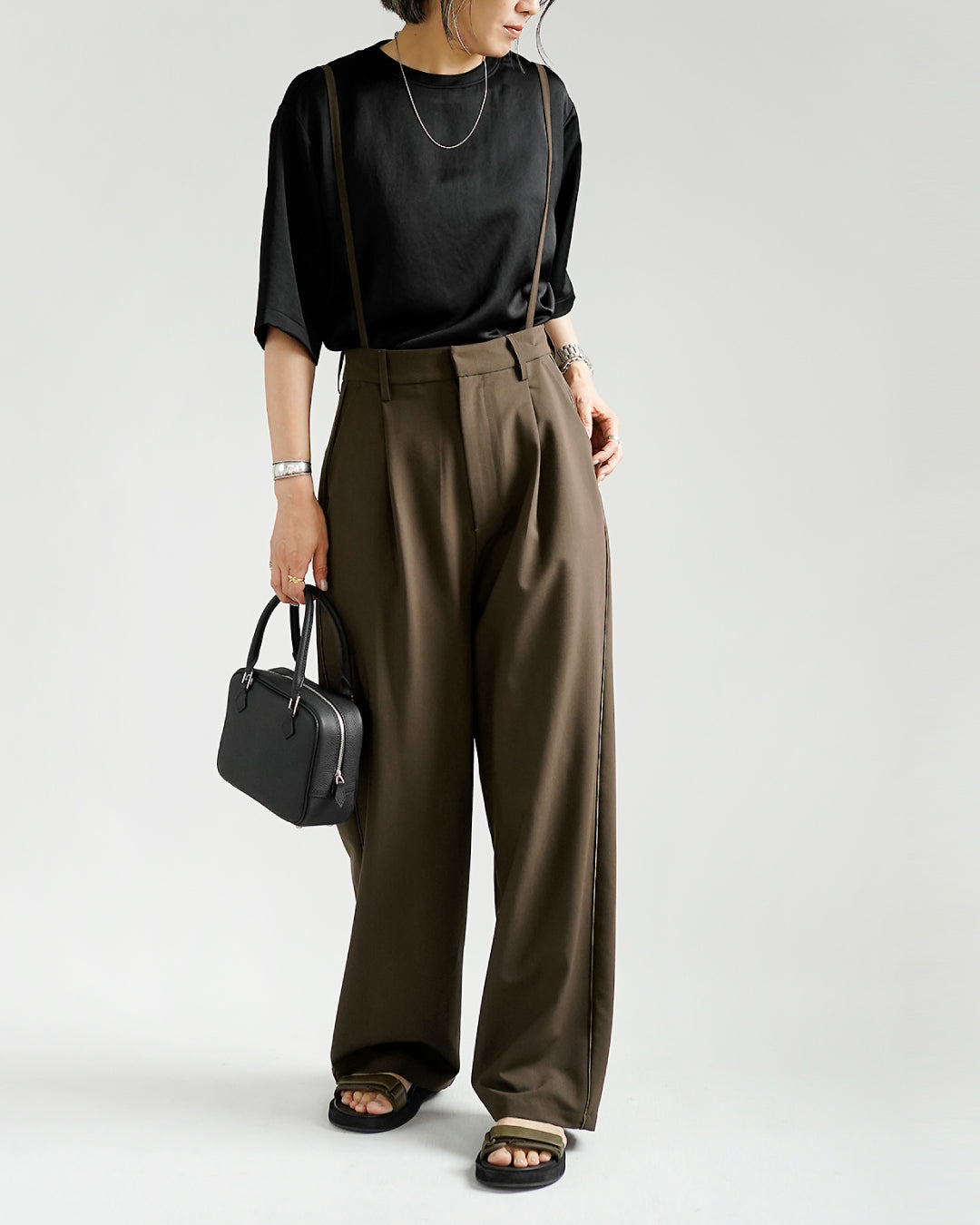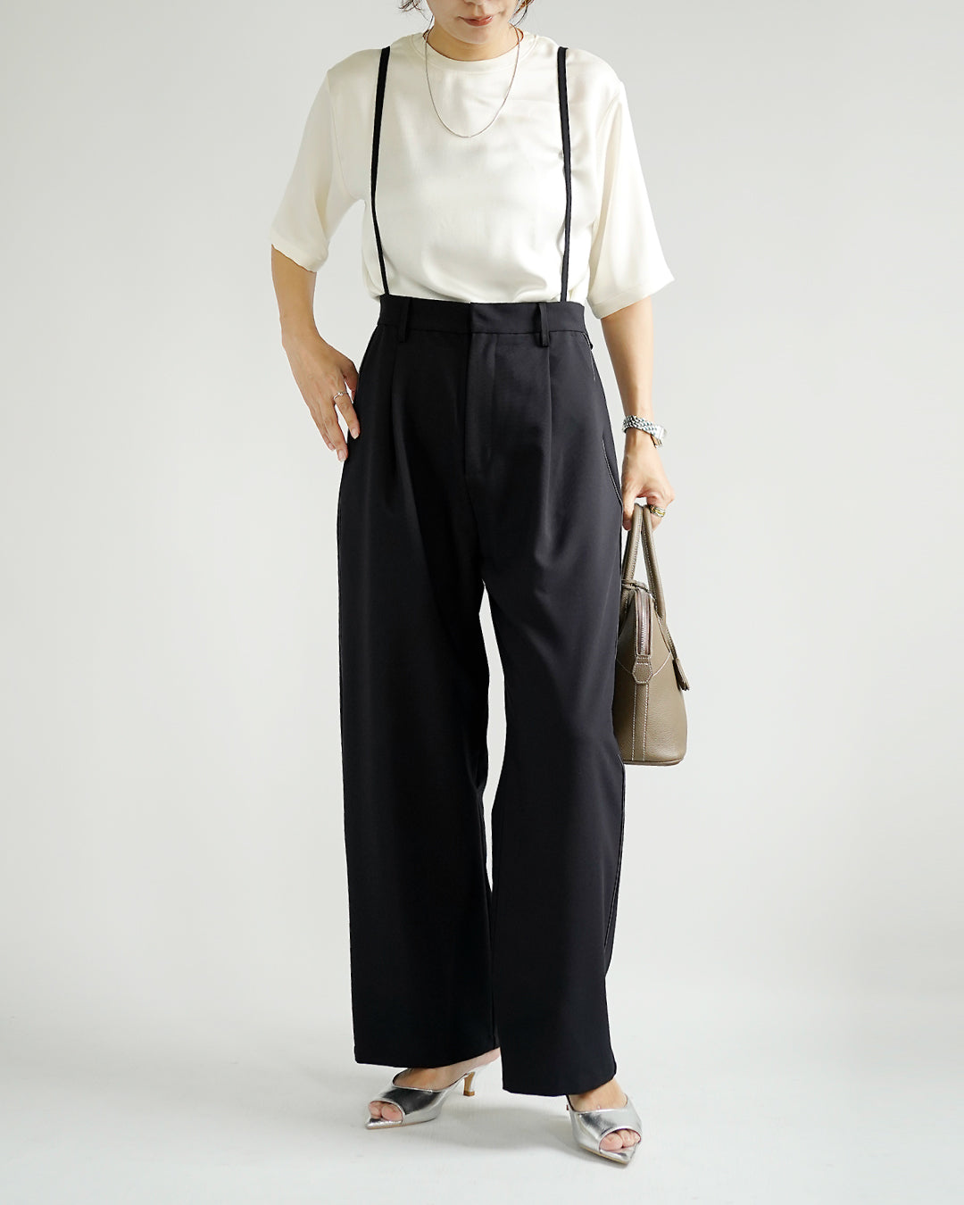 ベーシックになりがちなパンツコーデに、サスペンダーがあることで程よいアクセントと抜け感をプラス。