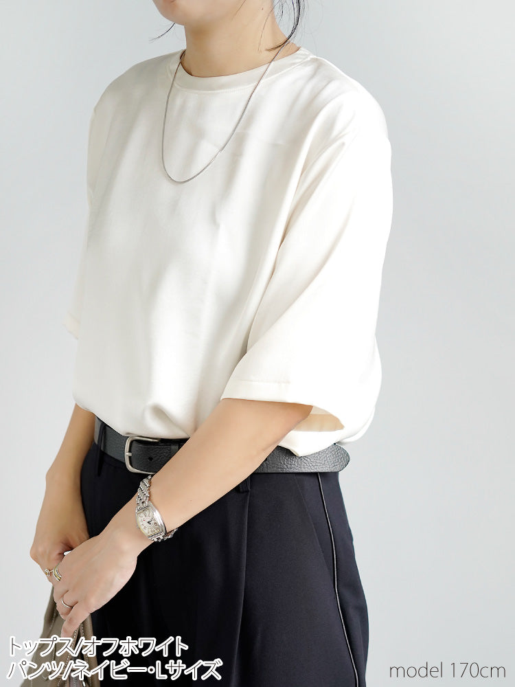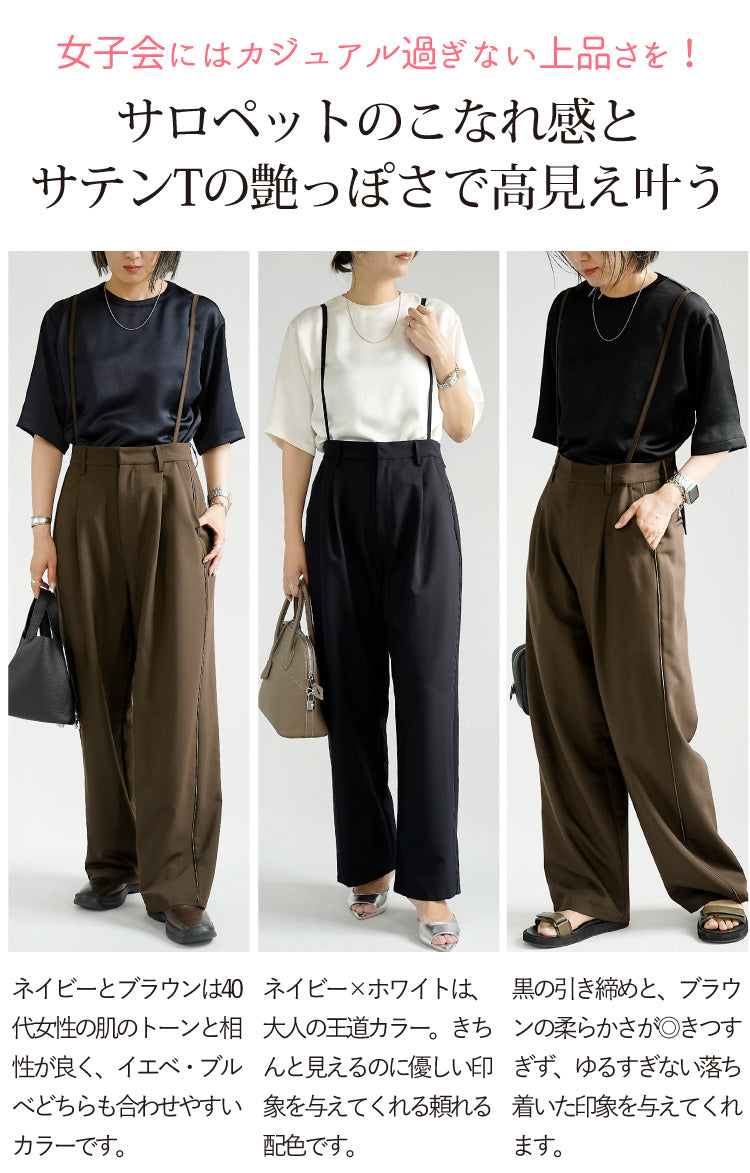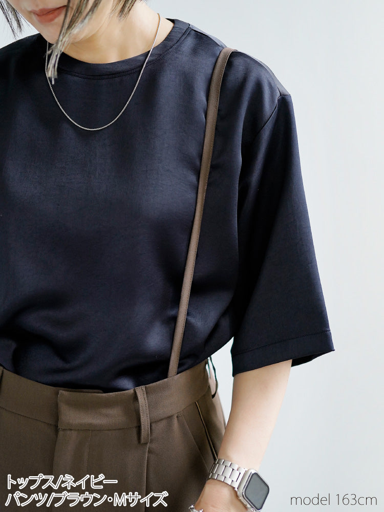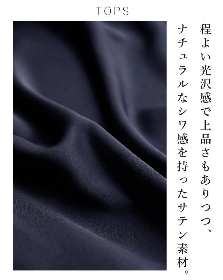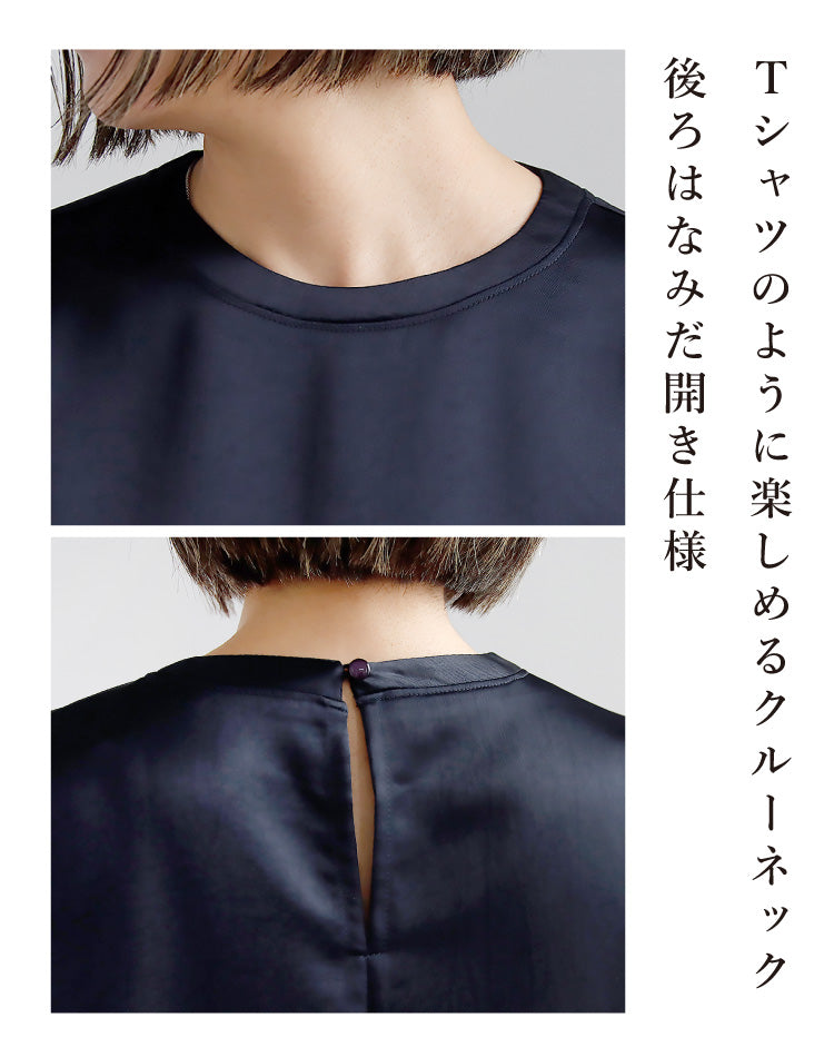 Tシャツが苦手な大人女子もサテン地の程よいツヤ感で上品な着こなしが叶います。