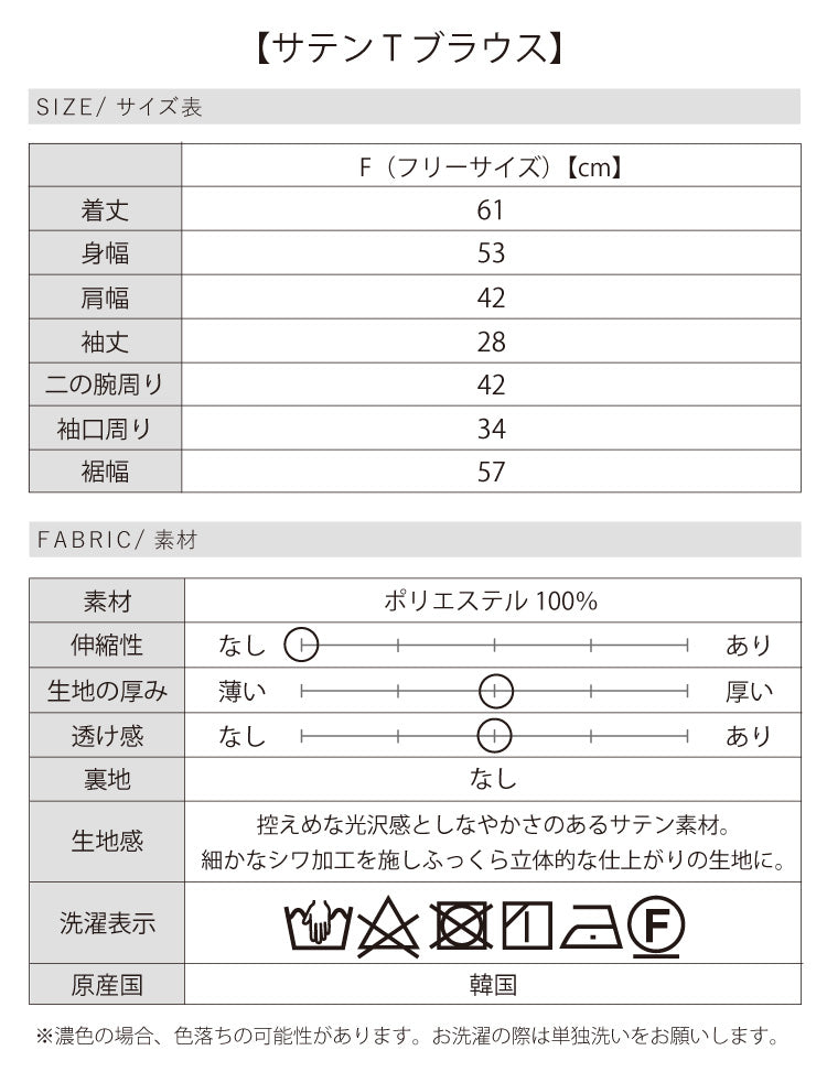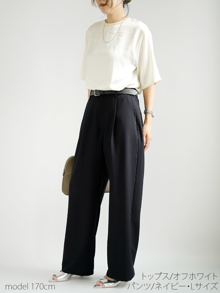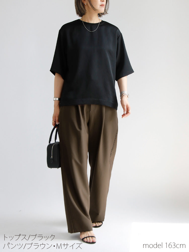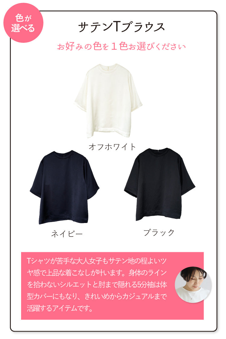 Tシャツが苦手な大人女子もサテン地の程よいツヤ感で上品な着こなしが叶います。