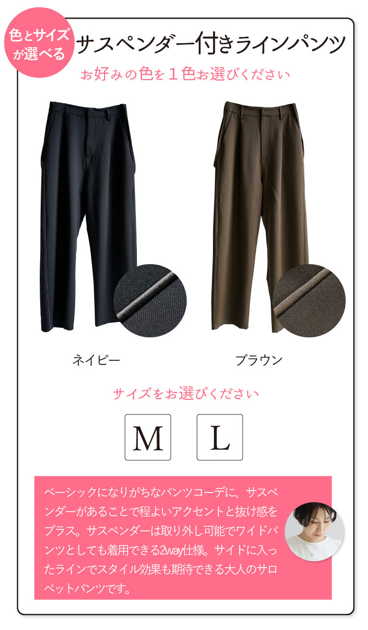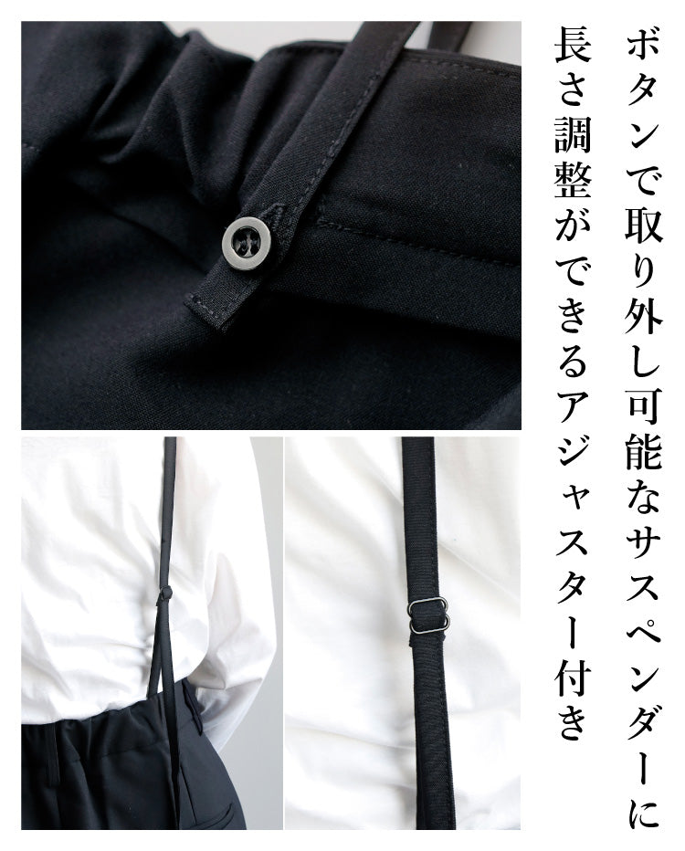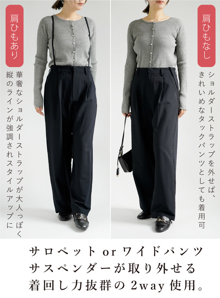 サスペンダーは取り外し可能でワイドパンツとしても着用できる2way仕様。