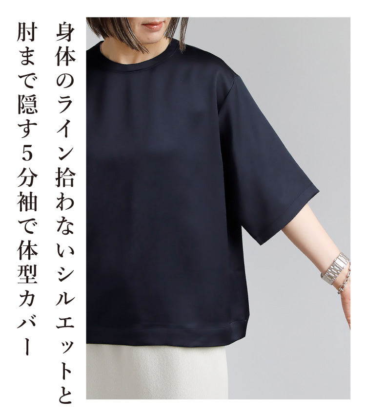 身体のラインを拾わないシルエットと肘まで隠れる5分袖は体型カバーにもなり、きれいめからカジュアルまで活躍するアイテムです。