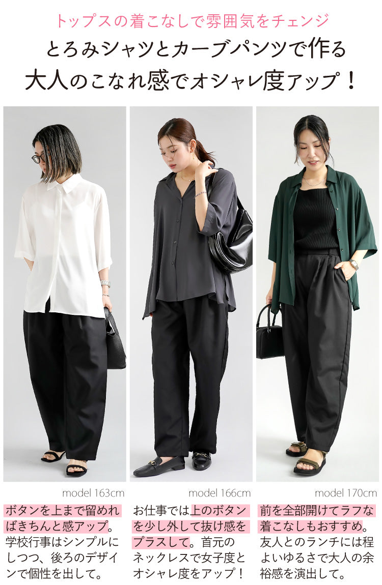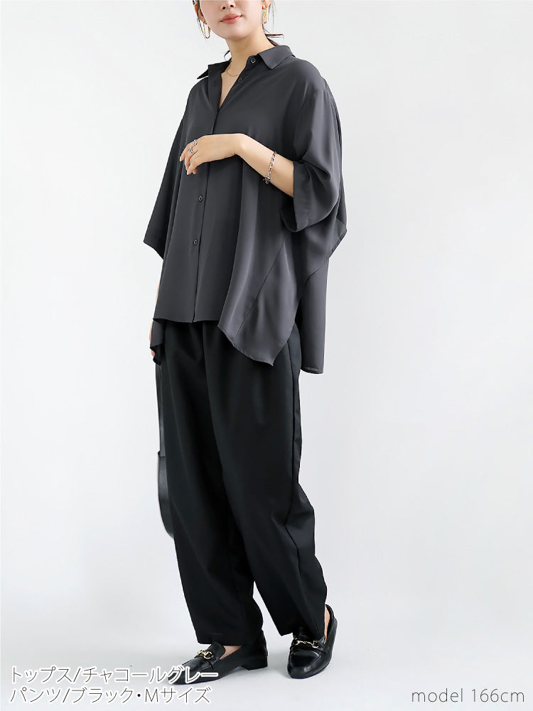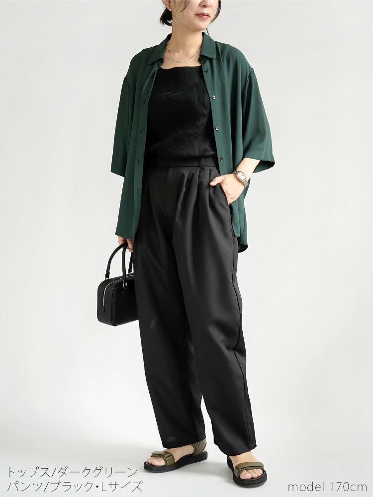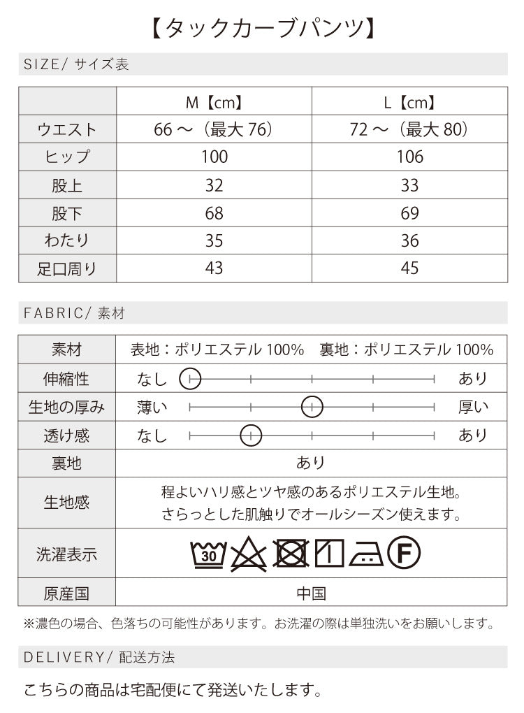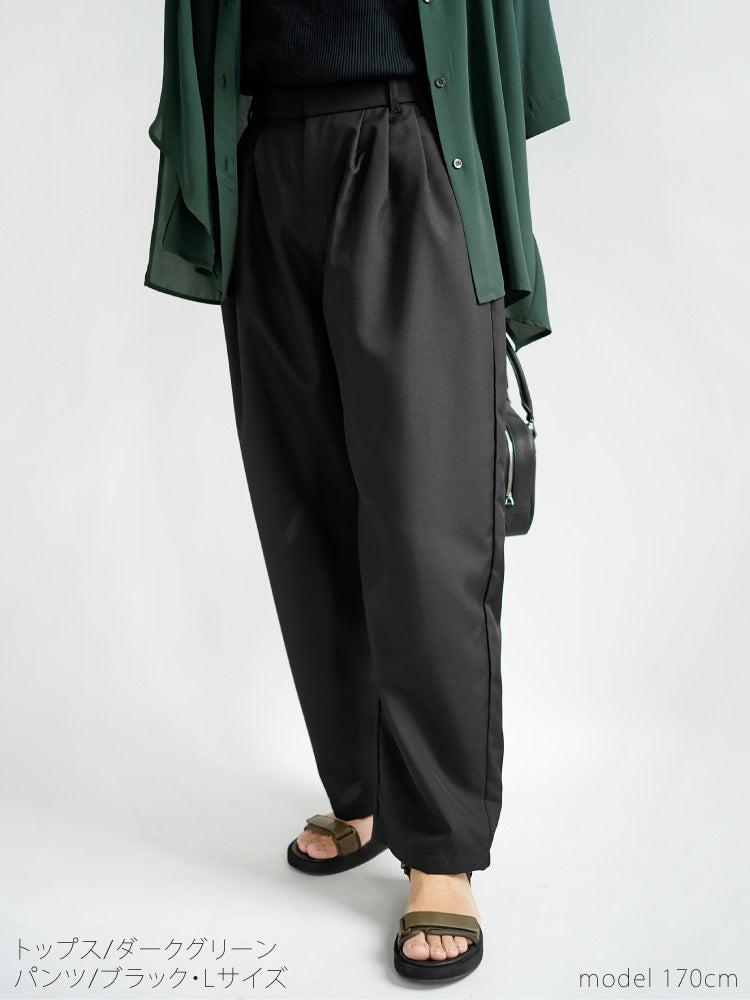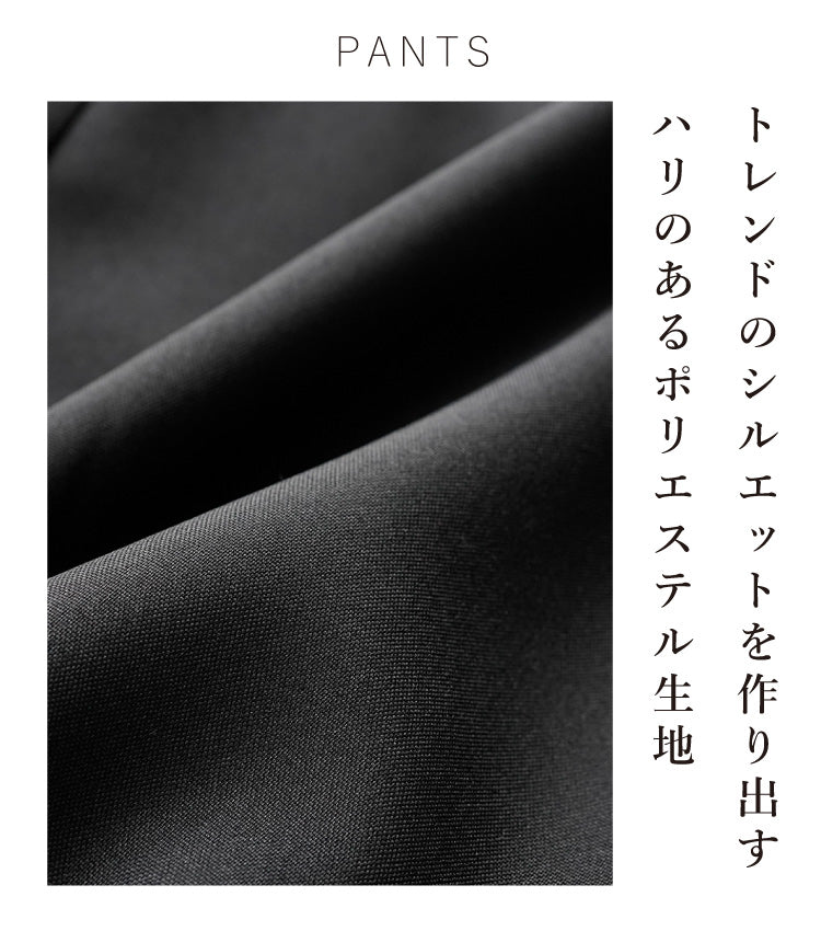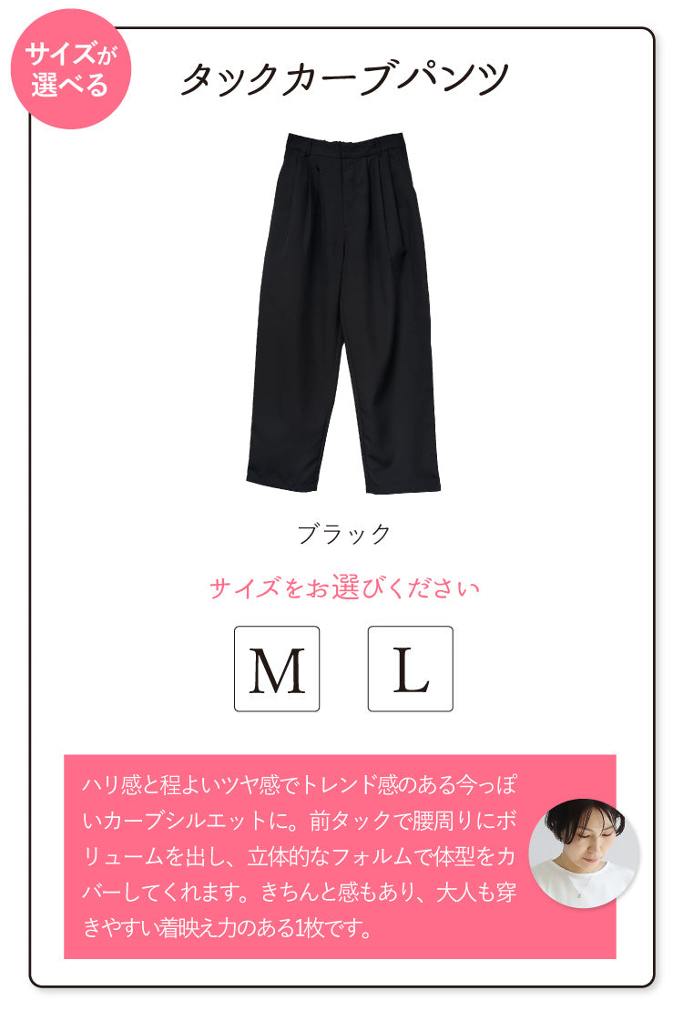 前タックで腰周りにボリュームを出し、立体的なフォルムで体型をカバーしてくれます。