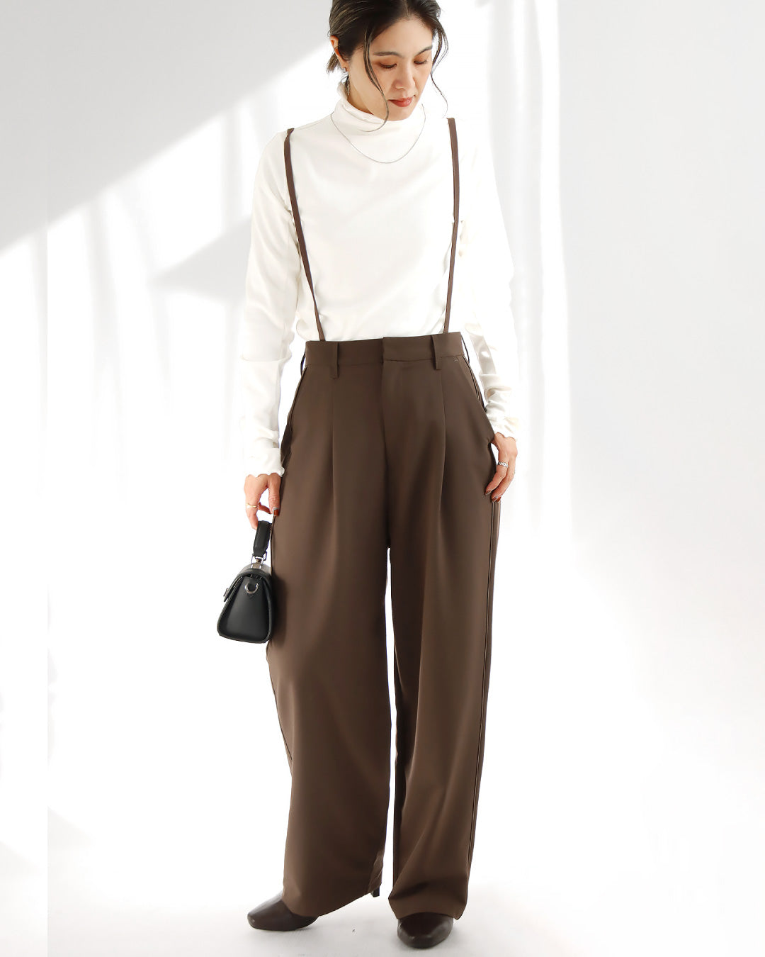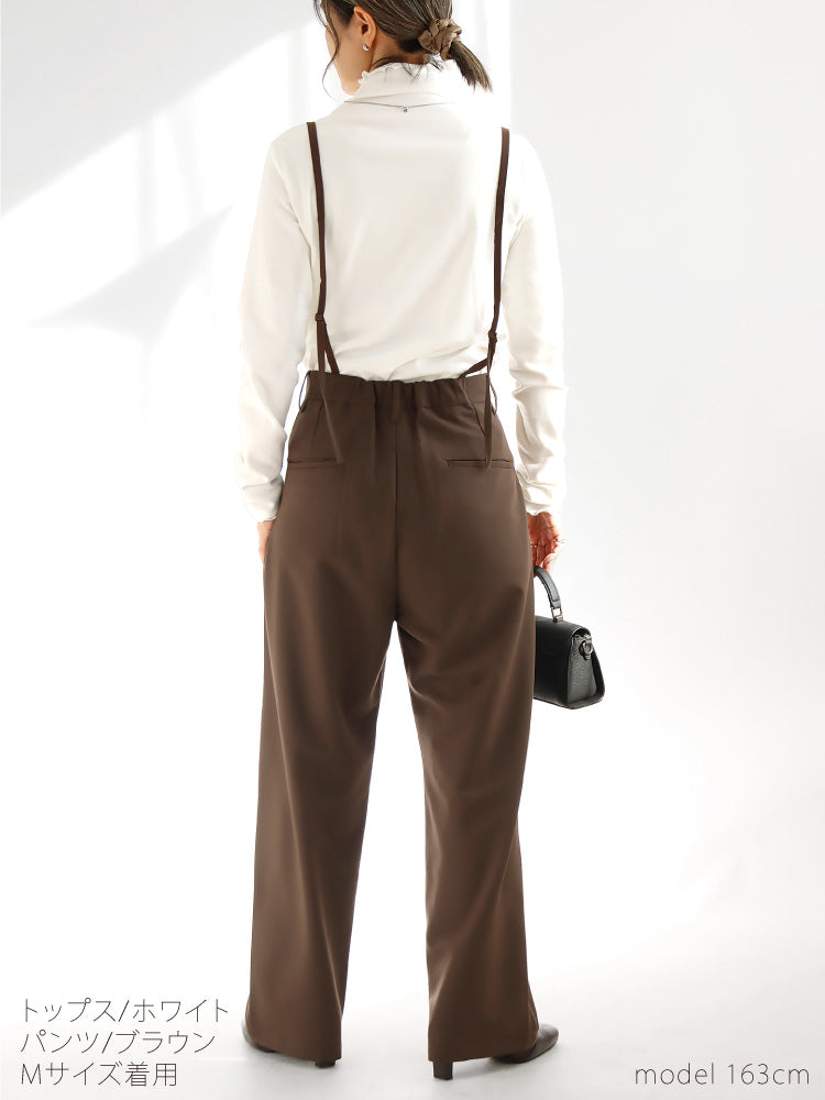 脚長効果絶大なサスペンダー付きワイドパンツは