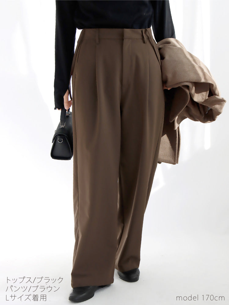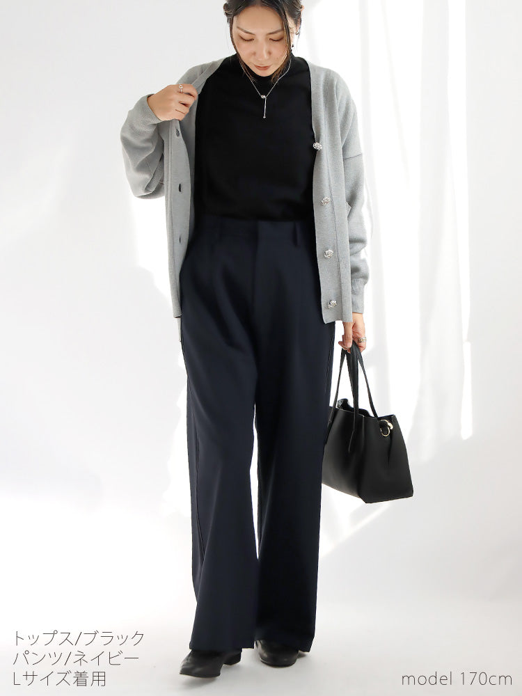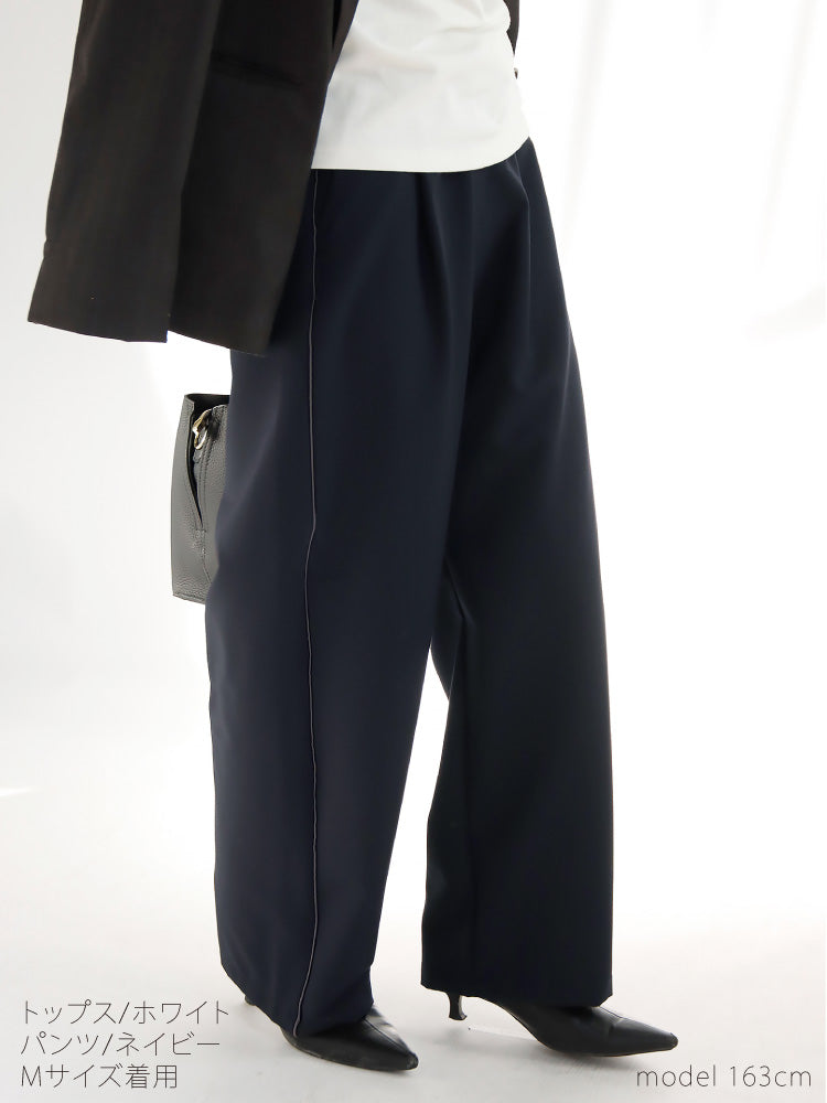 品よく美ラインなワイドパンツ。脚をすっきり見せるサイドラインがポイント。
