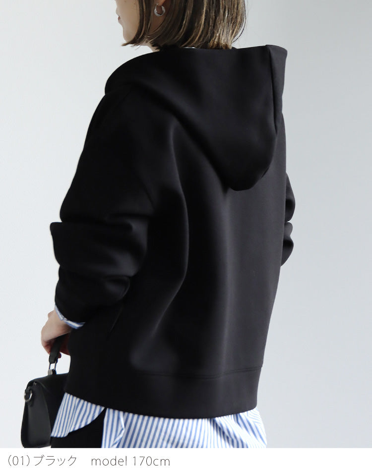 立体フードで高見えし、体のラインを拾いにくいゆったり設計。