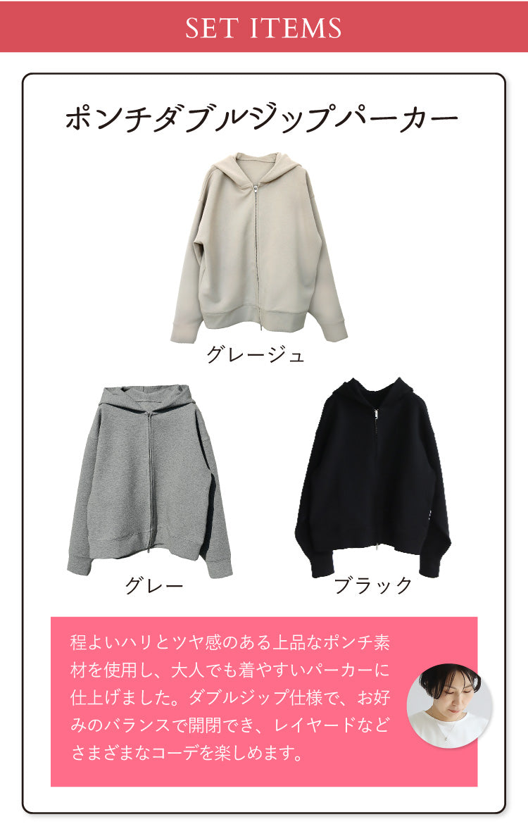 なめらかなポンチ素材で、セットでも単品でも着回し自在。
