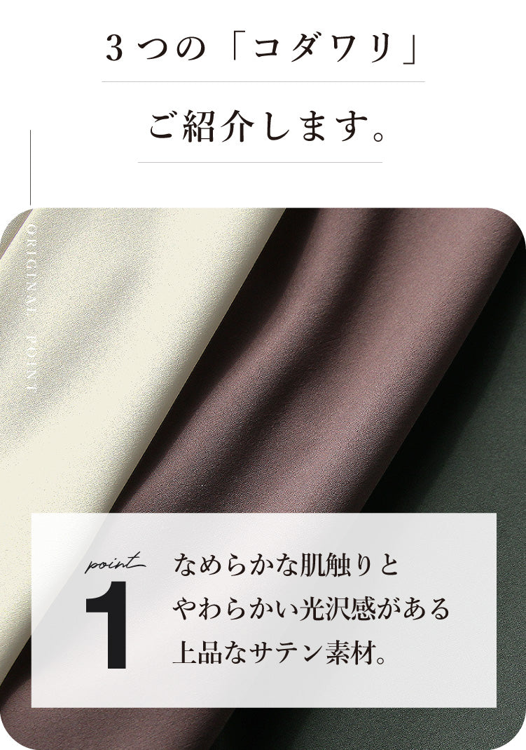 素材にもこだわり、なめらかな肌触りとやわらかい光沢感のある上品なサテンを使用。