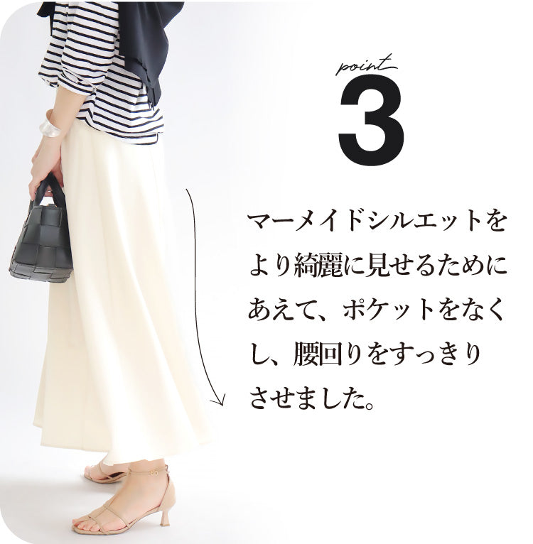 マーメイドラインを際立たせるために、ポケットを省略し、腰回りをすっきりさせています。
