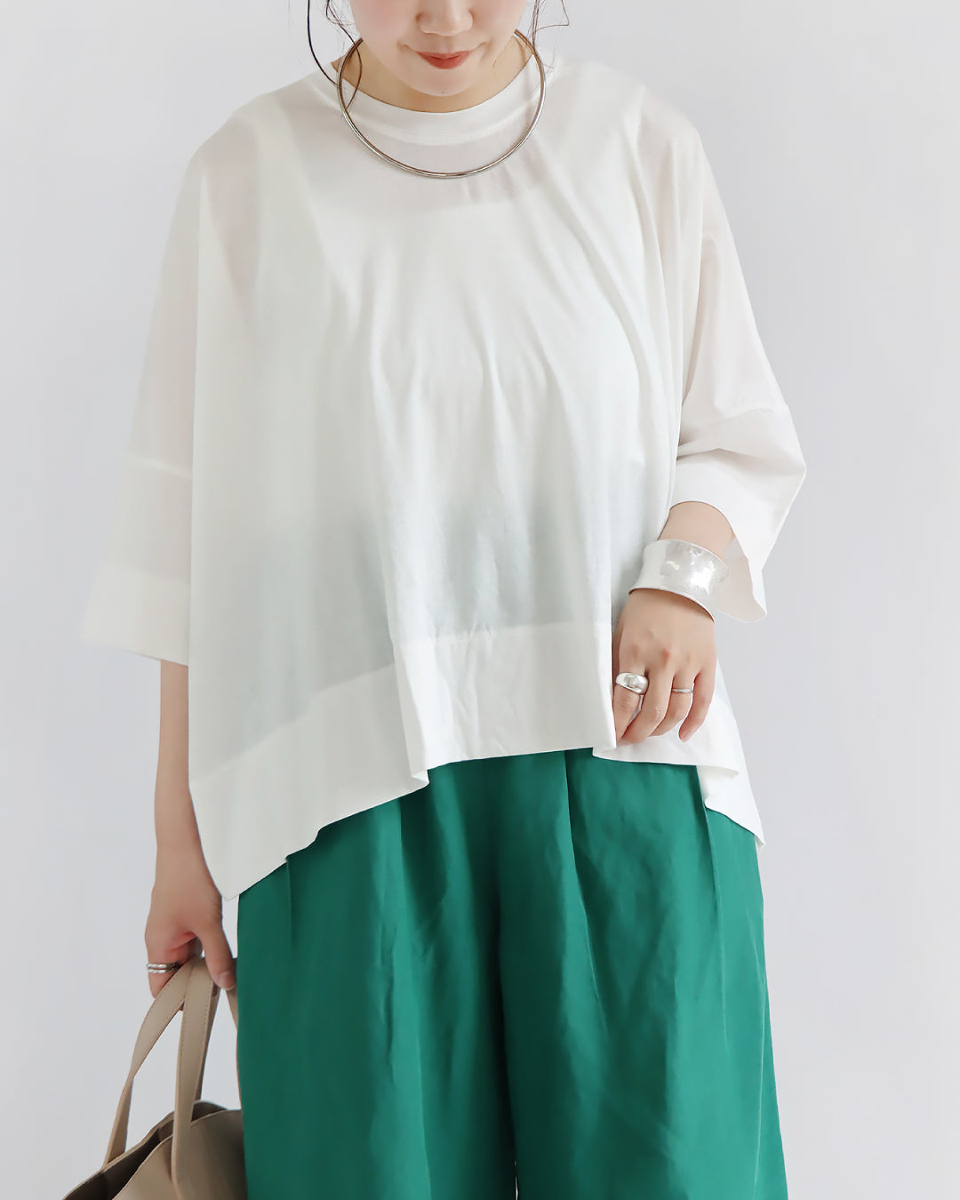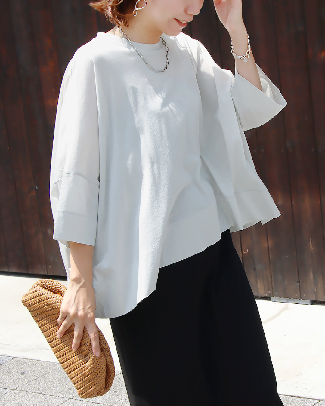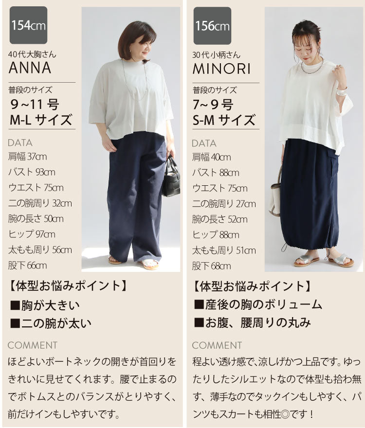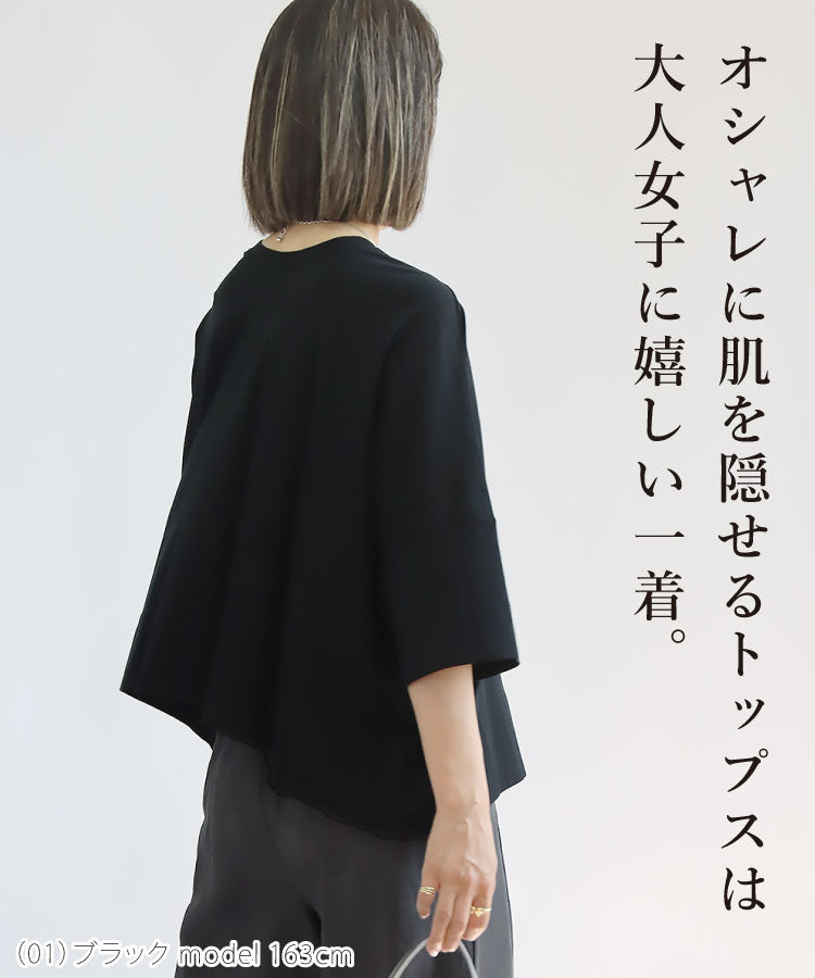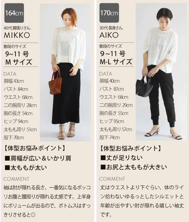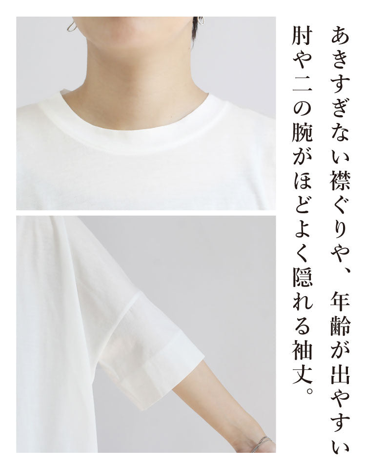 あきすぎない襟ぐりや、二の腕がしっかり隠れる袖丈が腕と胸周りを華奢見えに。
