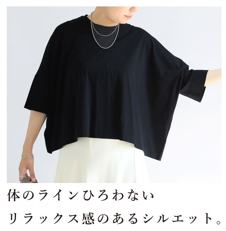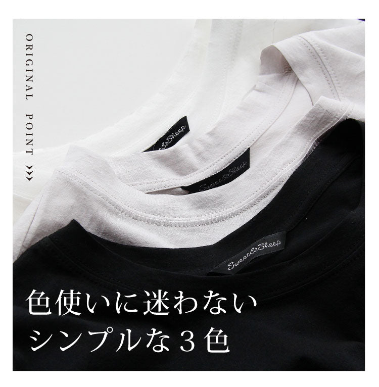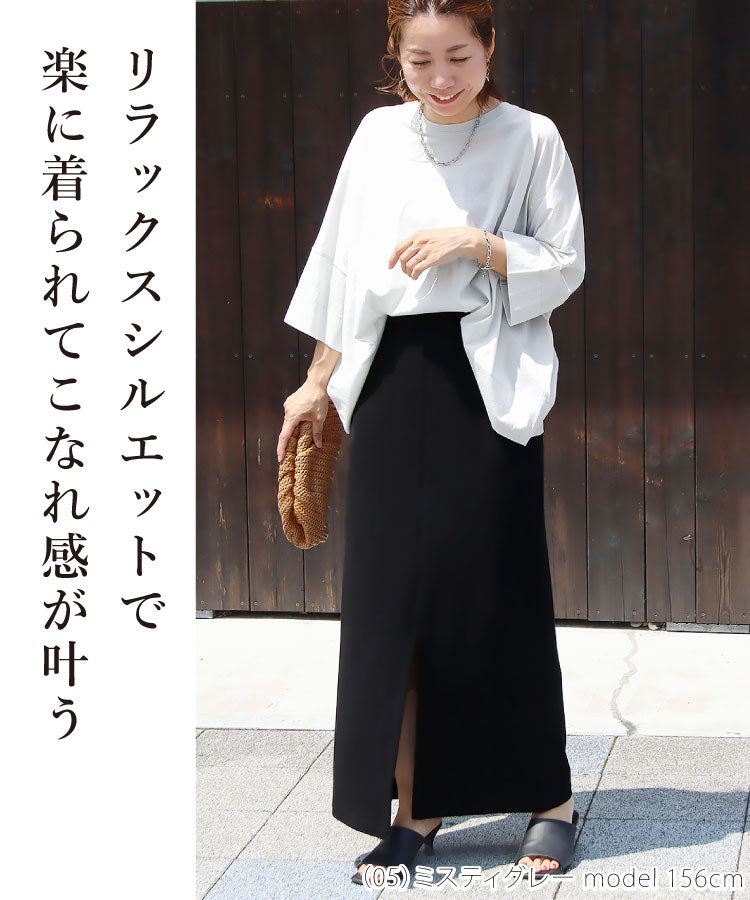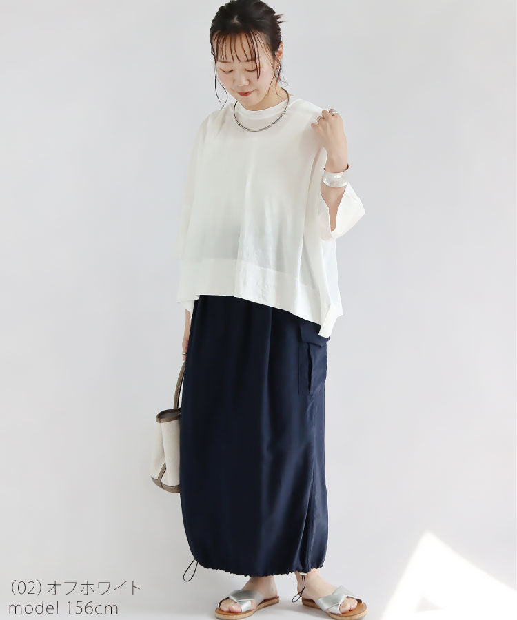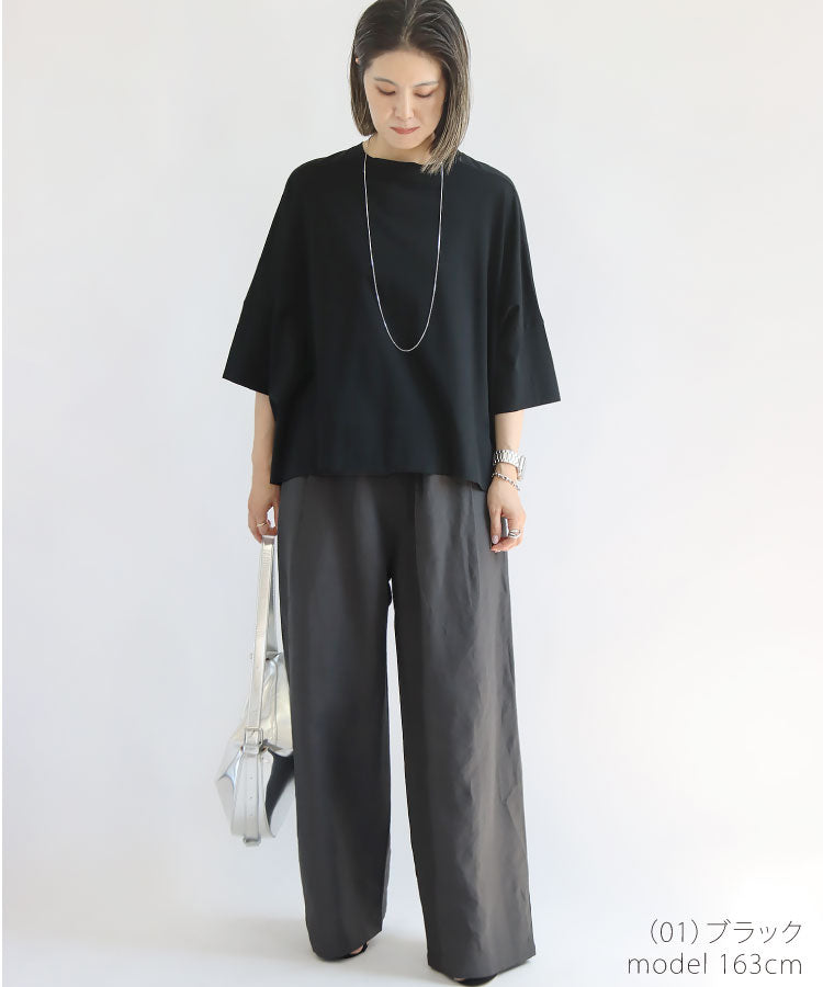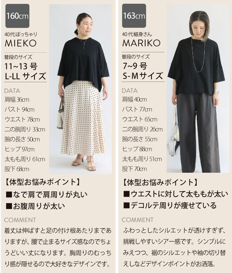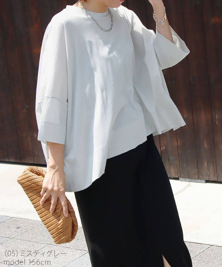 あきすぎない襟ぐりや、二の腕がしっかり隠れる袖丈が腕と胸周りを華奢見えに。