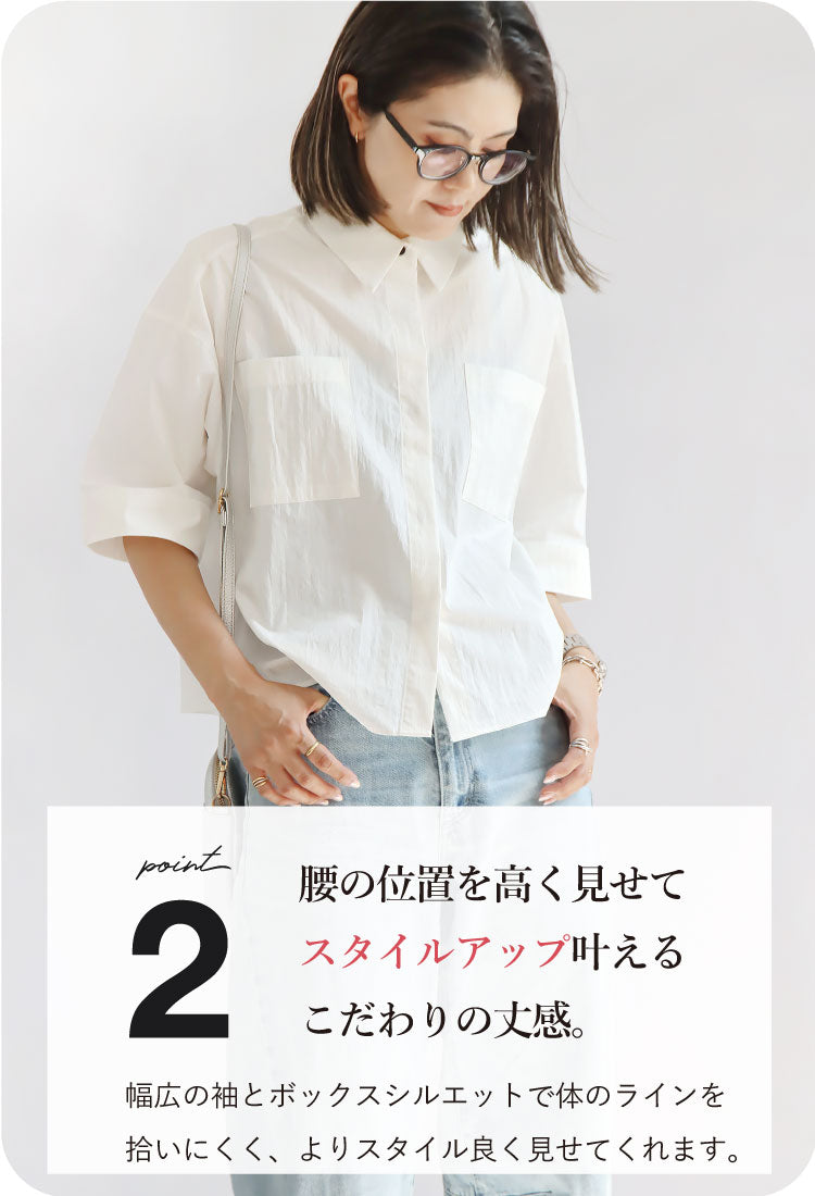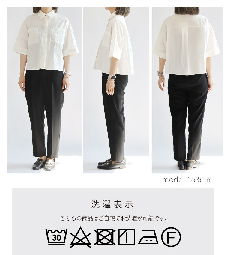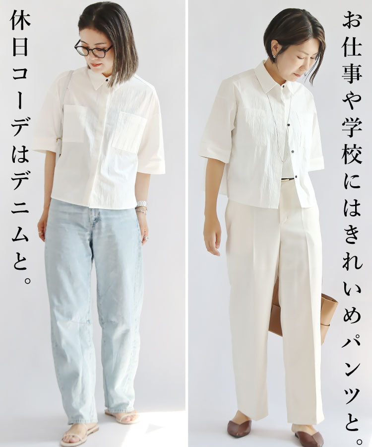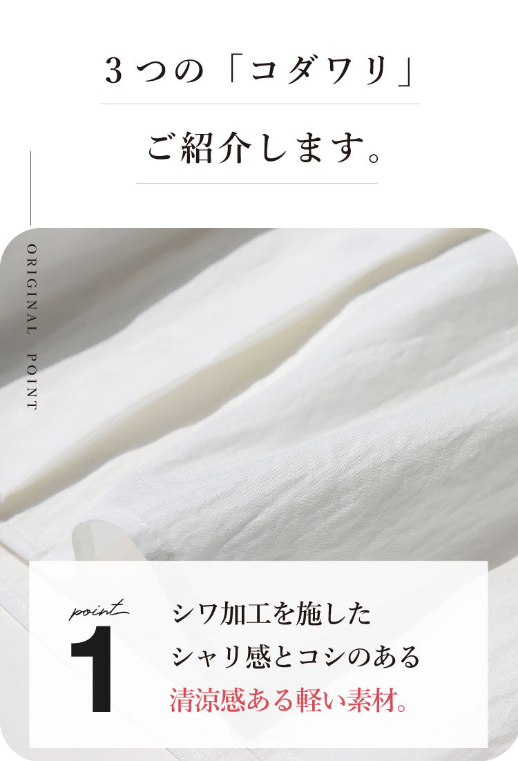 シャリ感とコシのあるシワ加工を施した軽い素材が清涼感を演出し、こだわりの丈感で腰の位置を高く見せることでスタイルアップ効果を発揮。