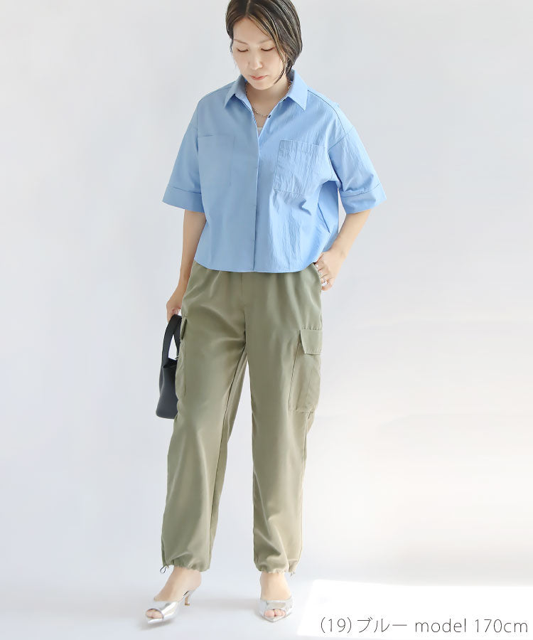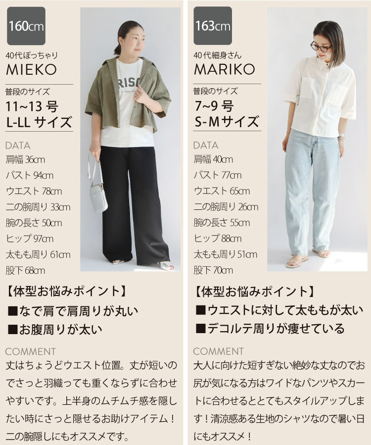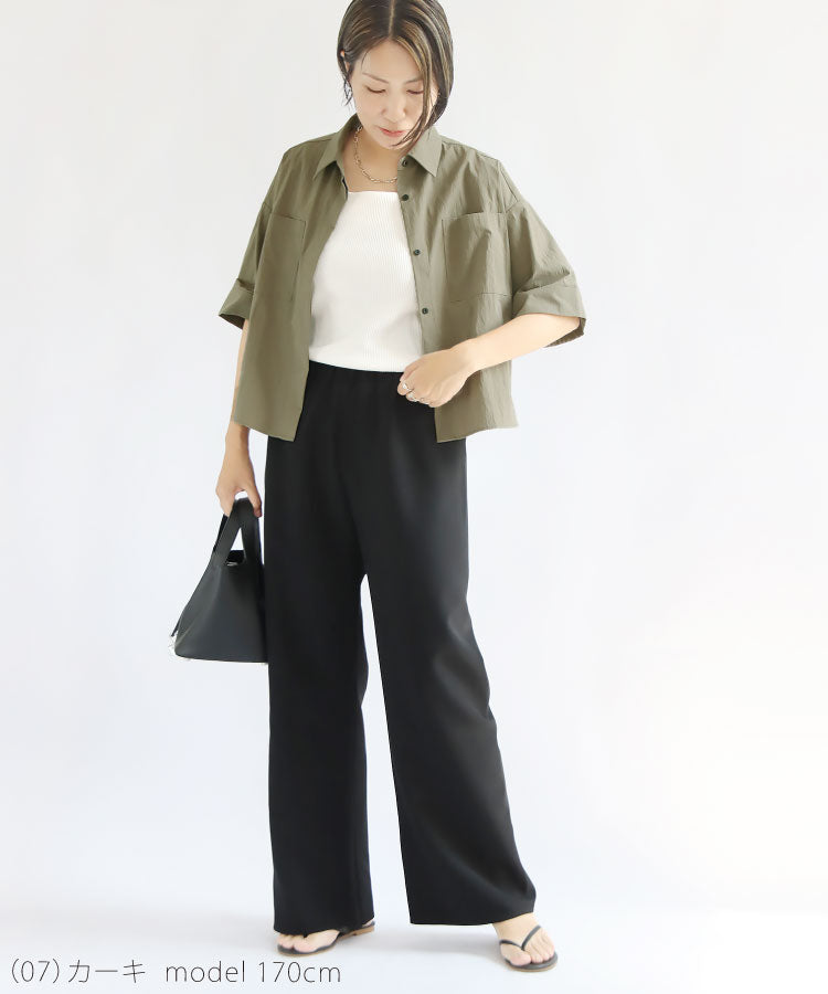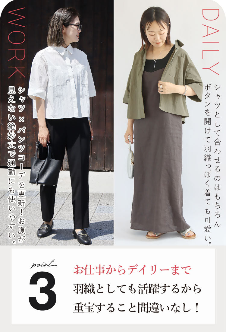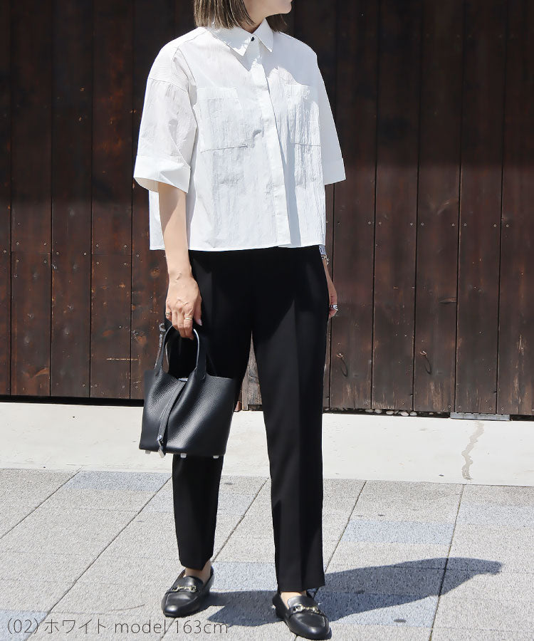 シャリ感とコシのあるシワ加工を施した軽い素材が清涼感を演出し、こだわりの丈感で腰の位置を高く見せることでスタイルアップ効果を発揮。