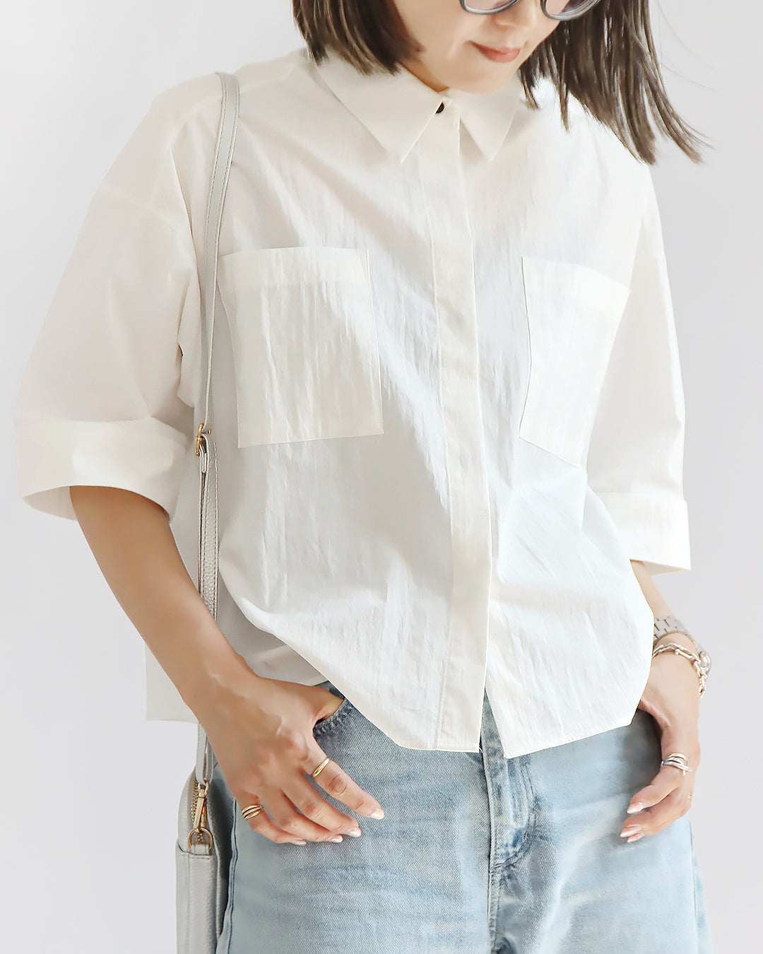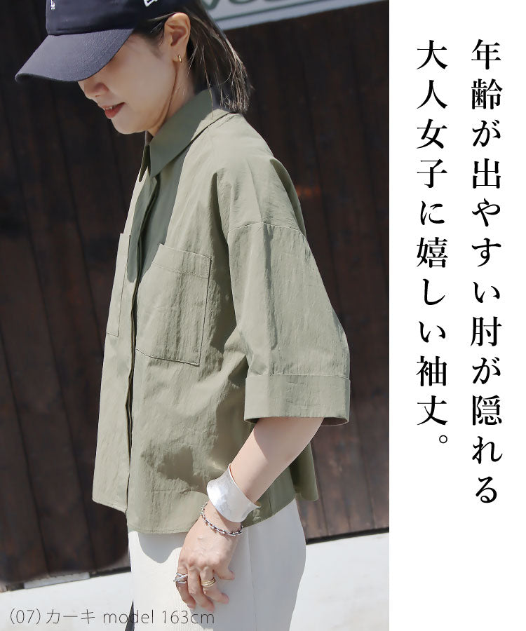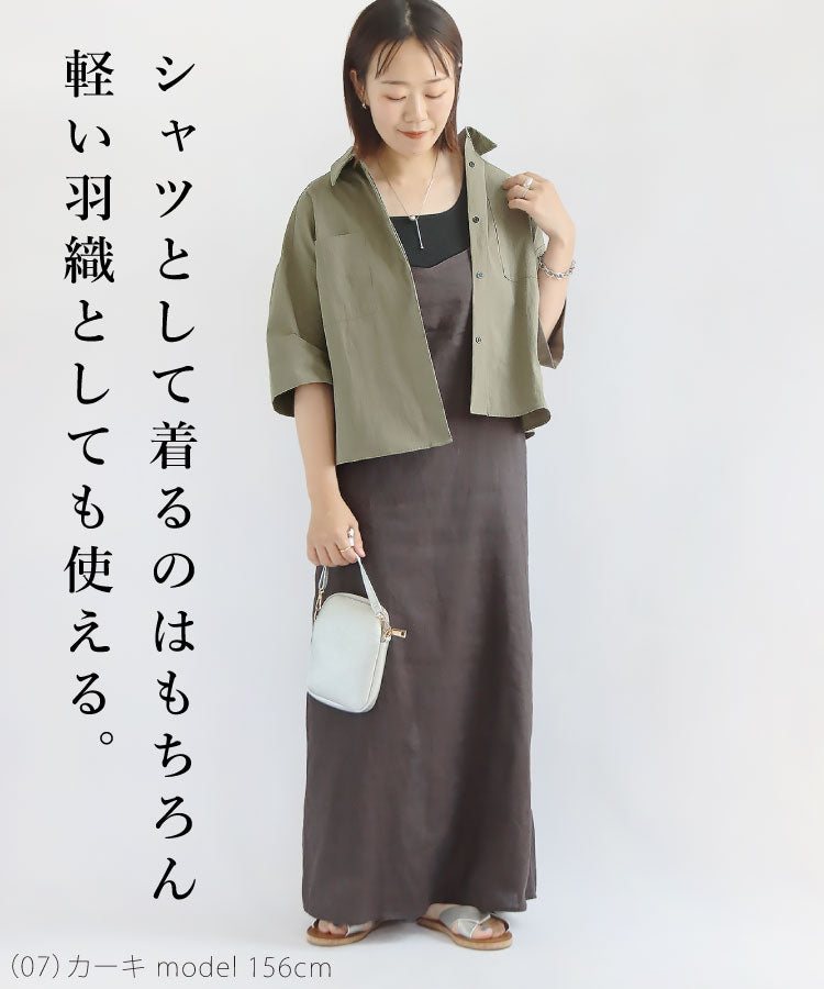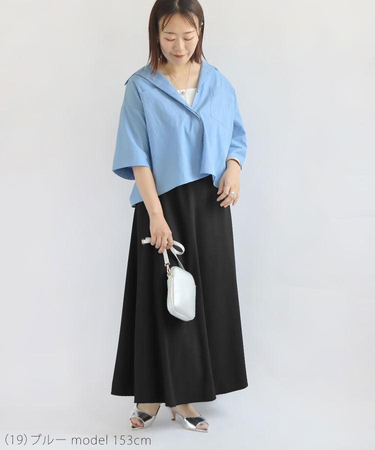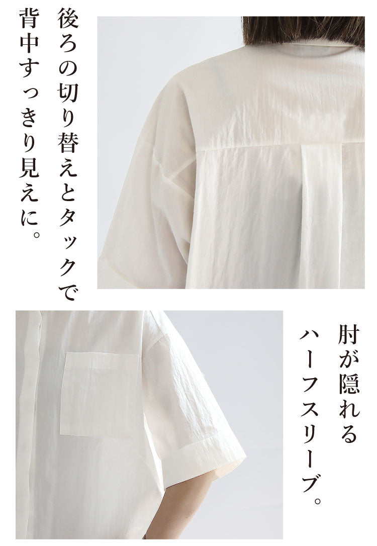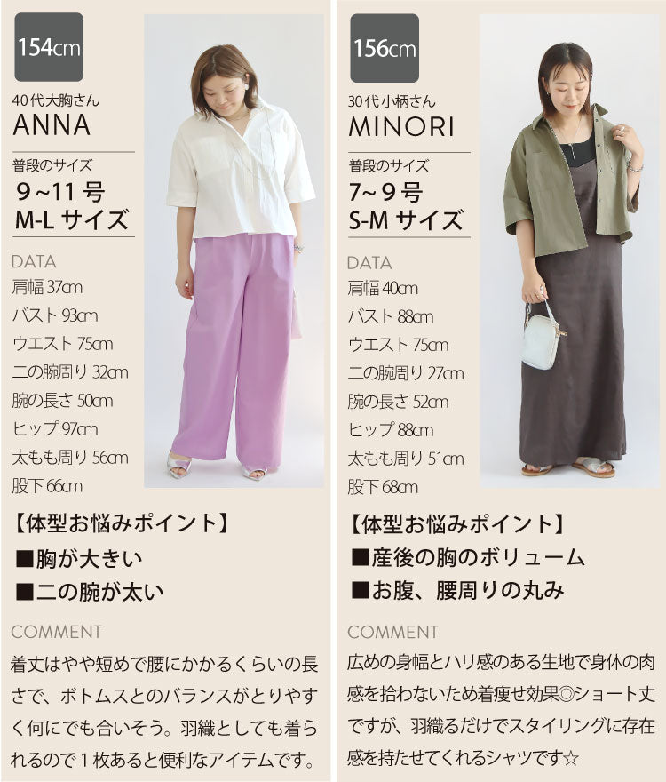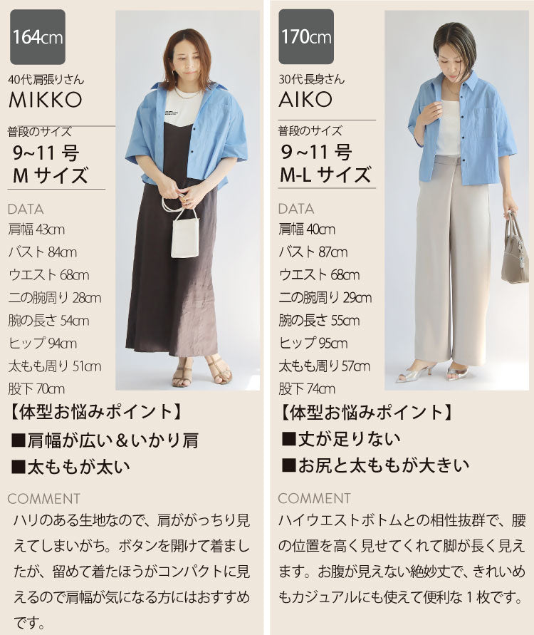 幅広の袖とボックスシルエットが体のラインを拾わず、より美しく魅せてくれるのがポイントです。