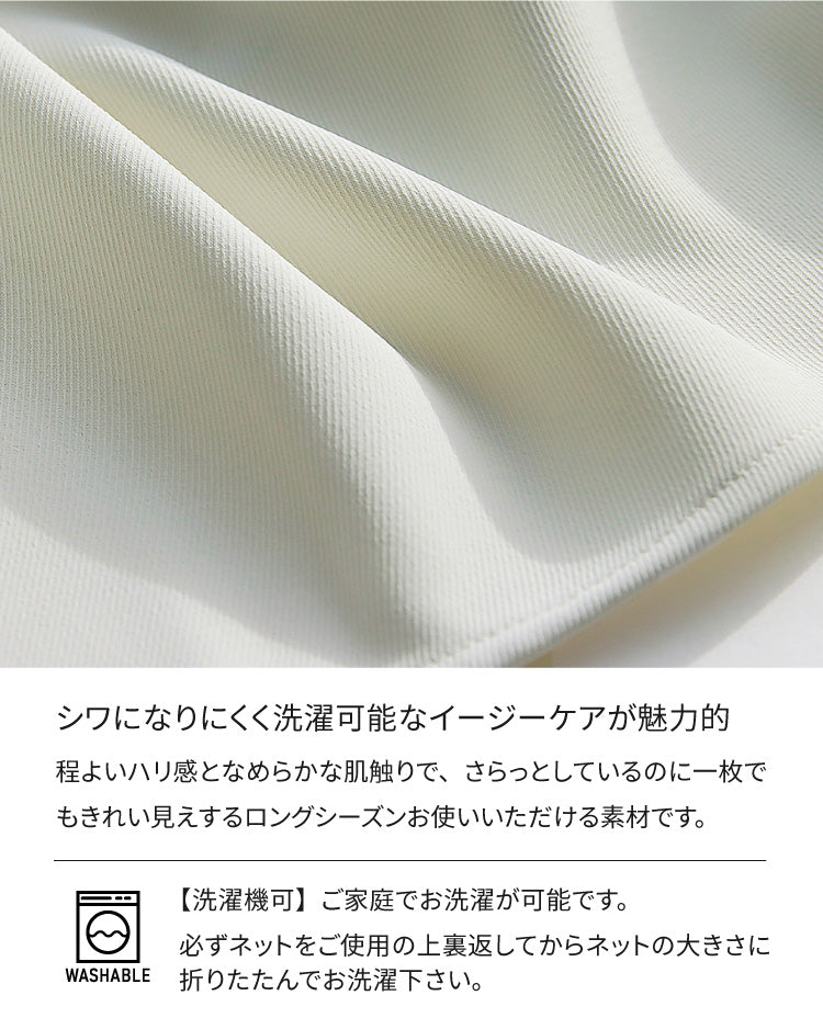 程よいハリ感となめらかな肌触りで、さらっとしているのに一枚でもきれい見えするロングシーズンお使いいただける素材です。