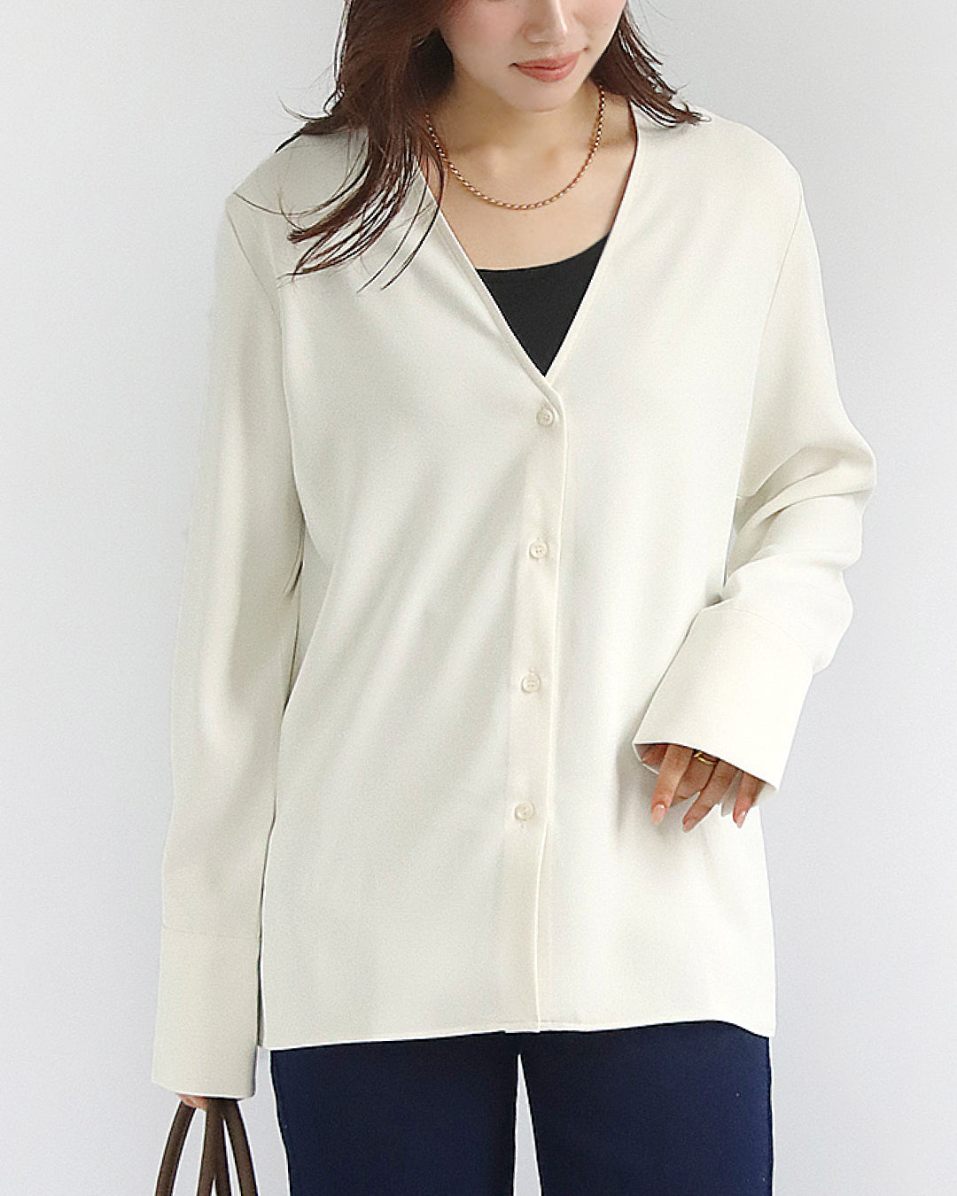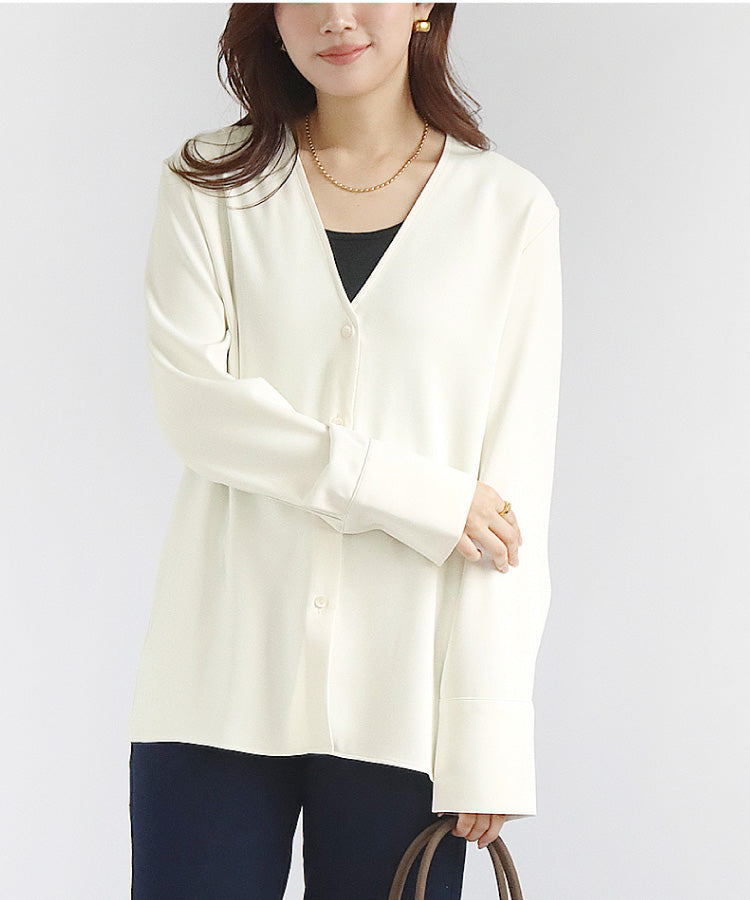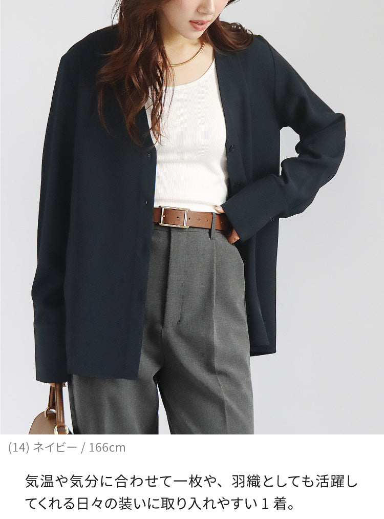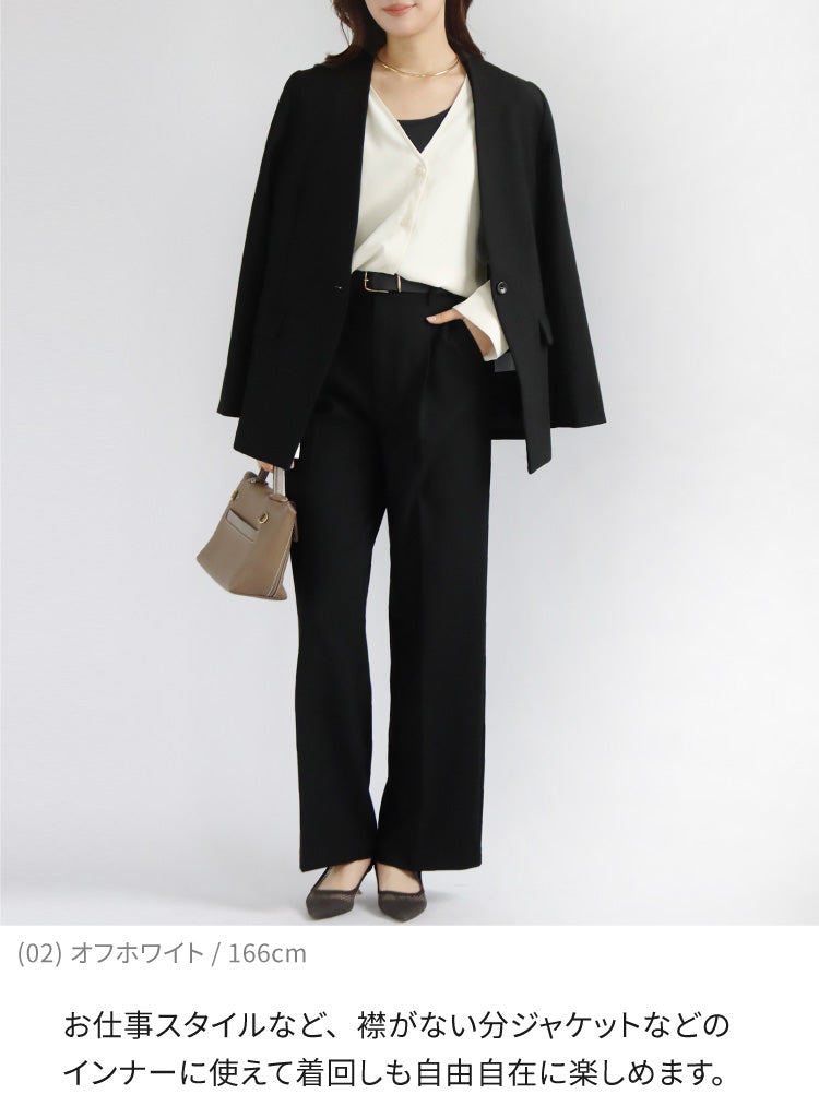 お仕事スタイルなど、襟がない分ジャケットなどの