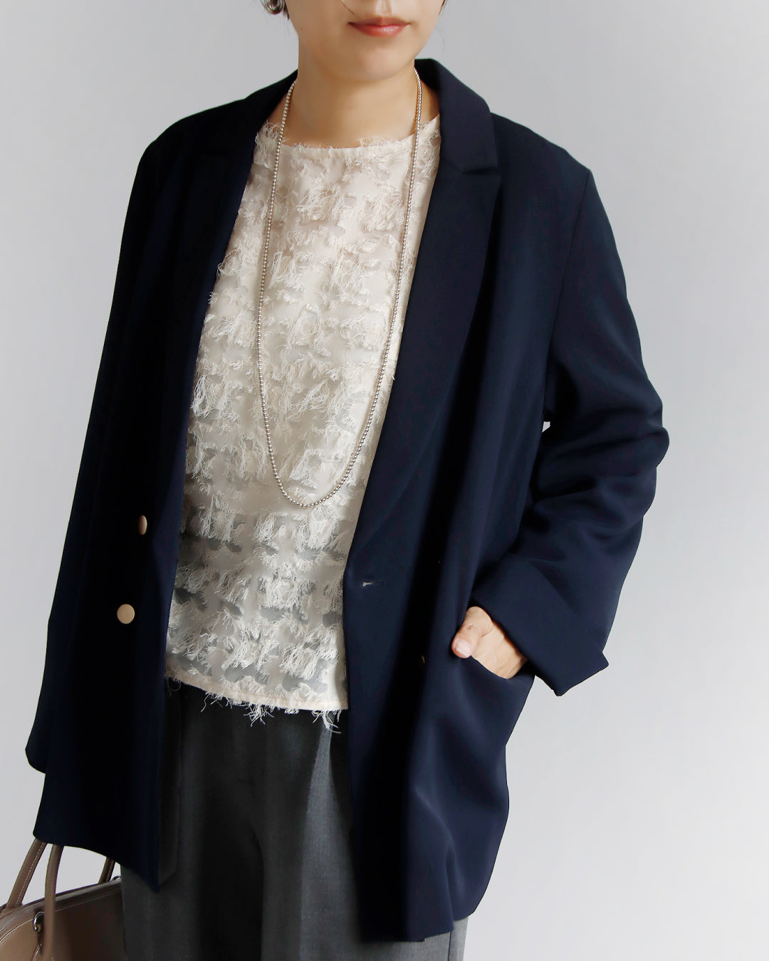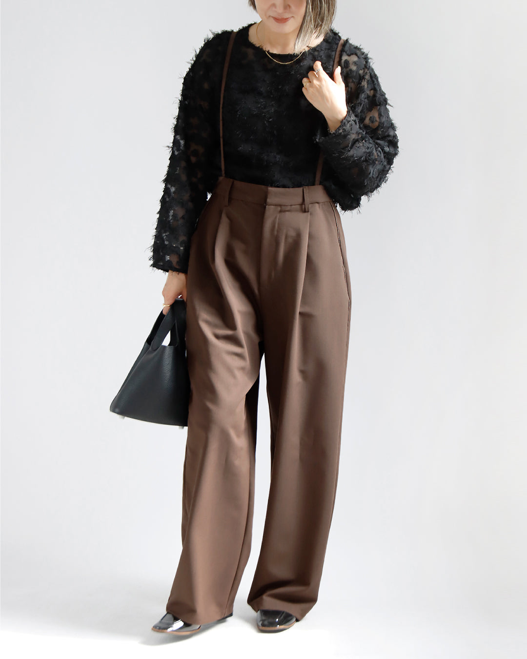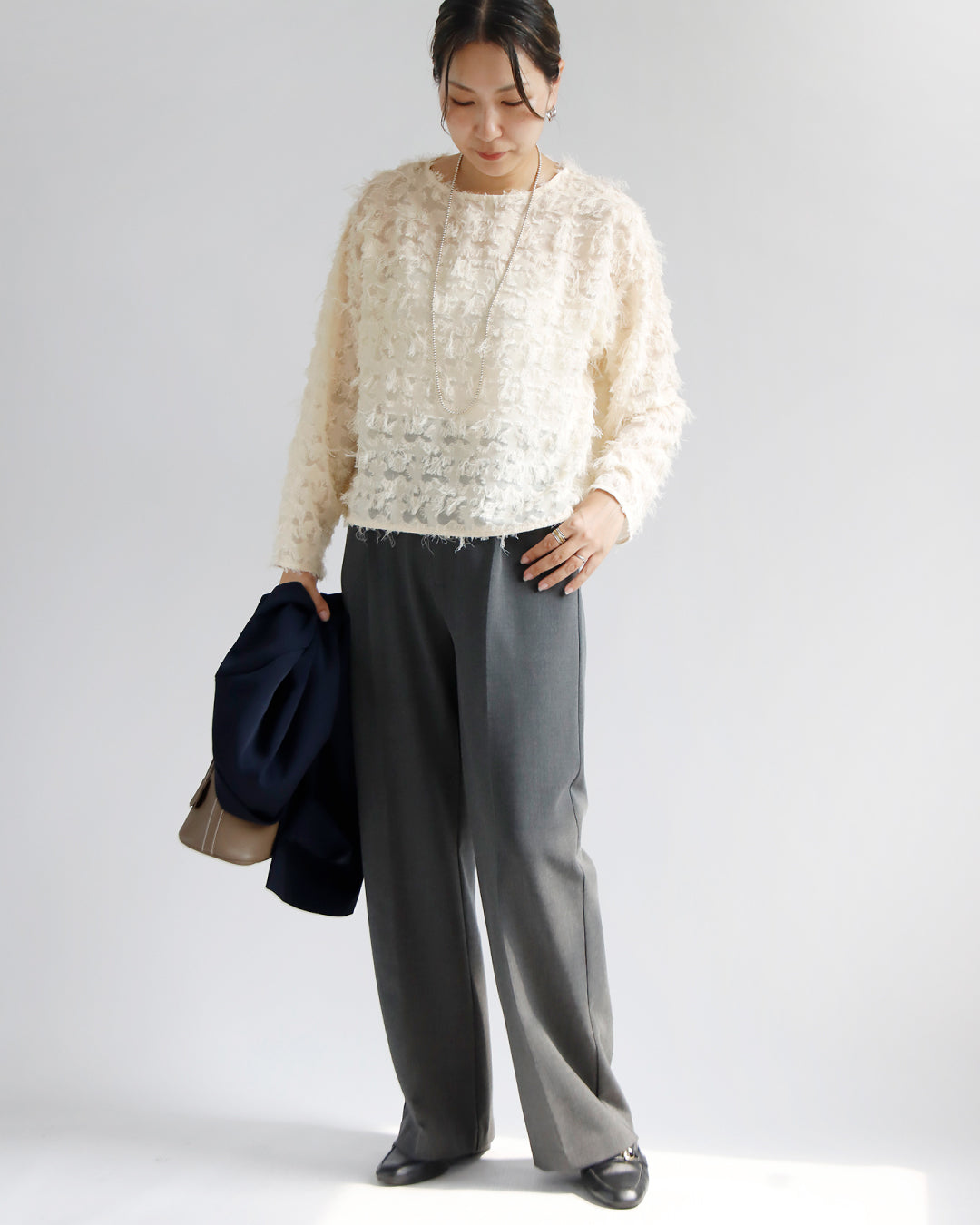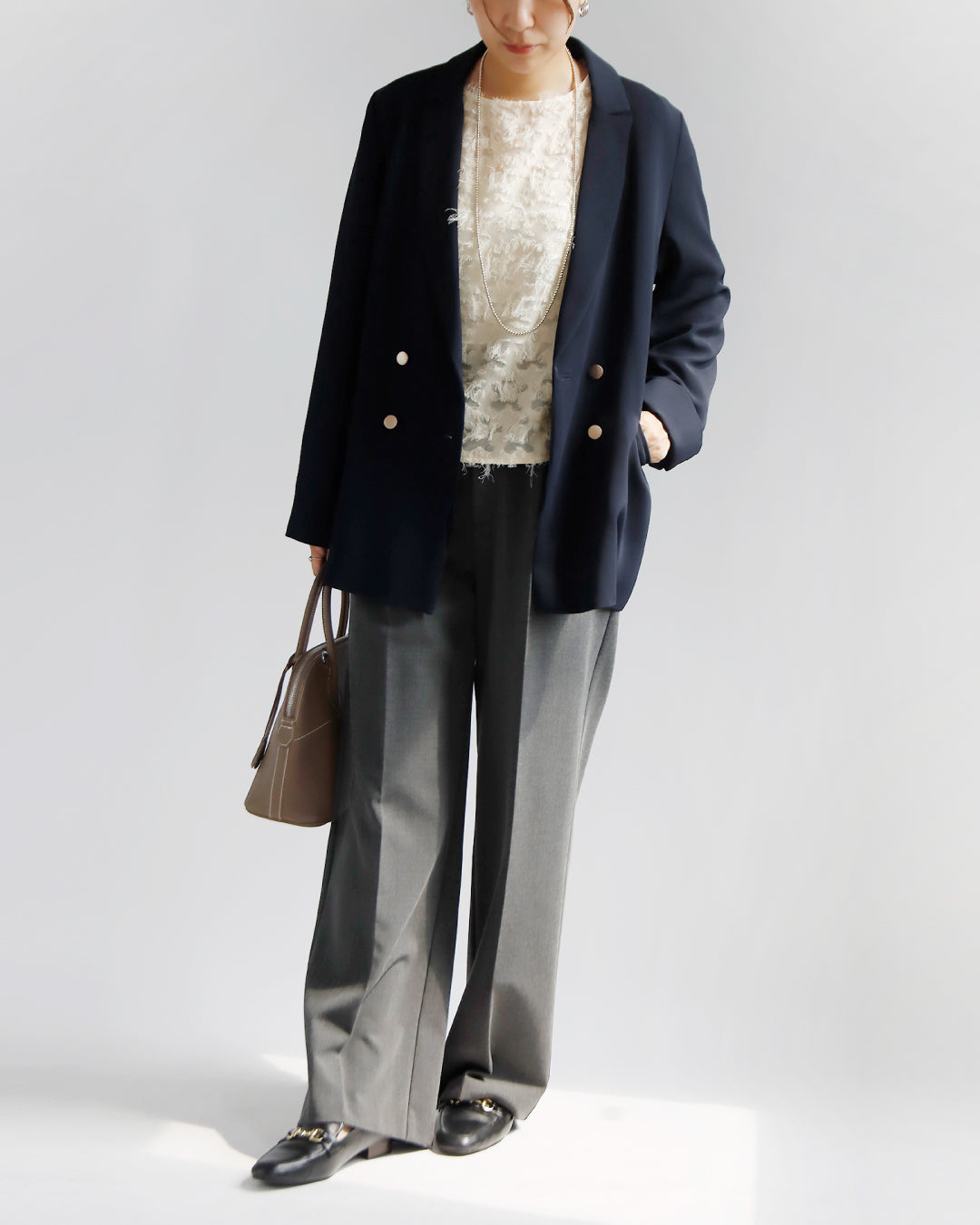 インナーは同色系を選ぶと同調されてまとまりが生まれ、大人っぽい洗練された印象に仕上がります。