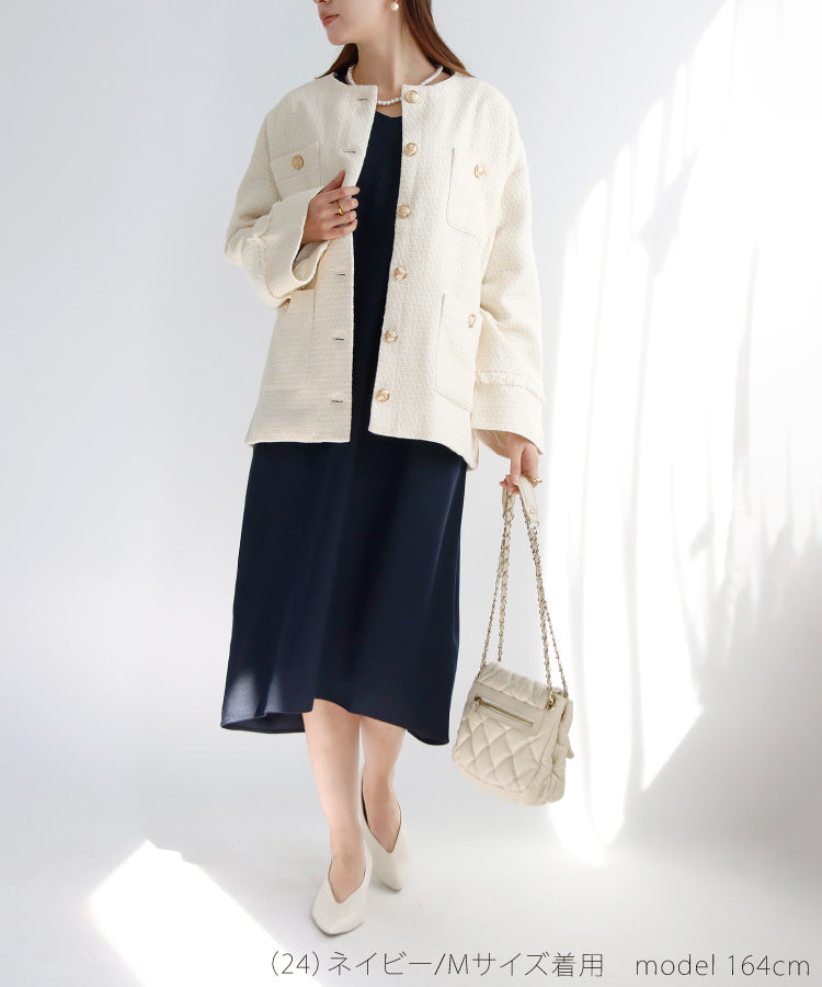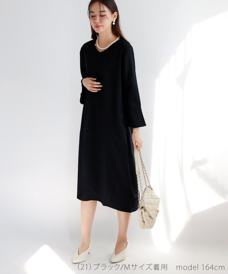 品のあるマットな光沢素材で、落ち着いた上品な印象に。顔まわりをすっきり見せるVネックと、