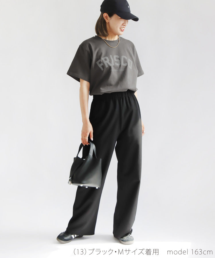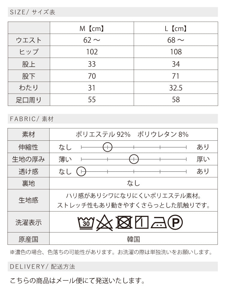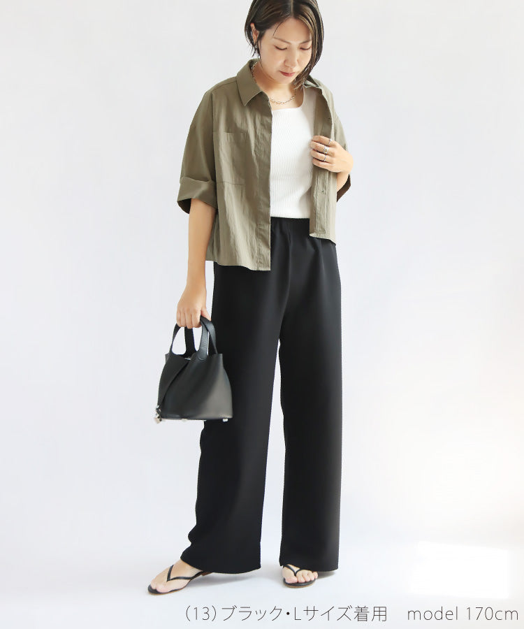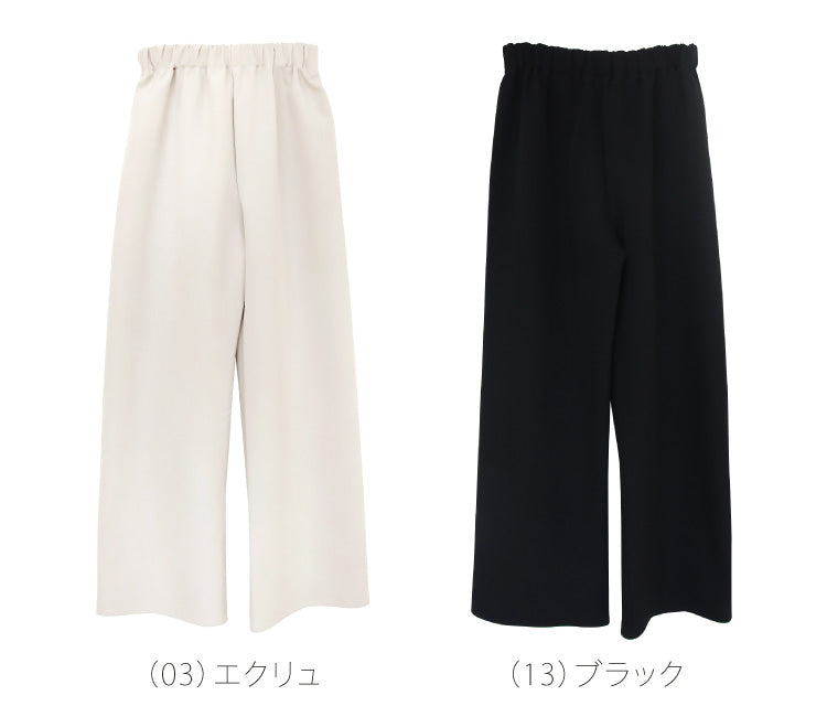 ウエストは総ゴム仕様で、内側の紐でサイズ調節が可能です。ストレッチ性があり、股上深めの設計でしゃがむ動作も快適。さらっとした肌触りのシーズンレスな生地は、淡色でも透けにくいしっかりとした素材で、いつでも安心して着用できます。