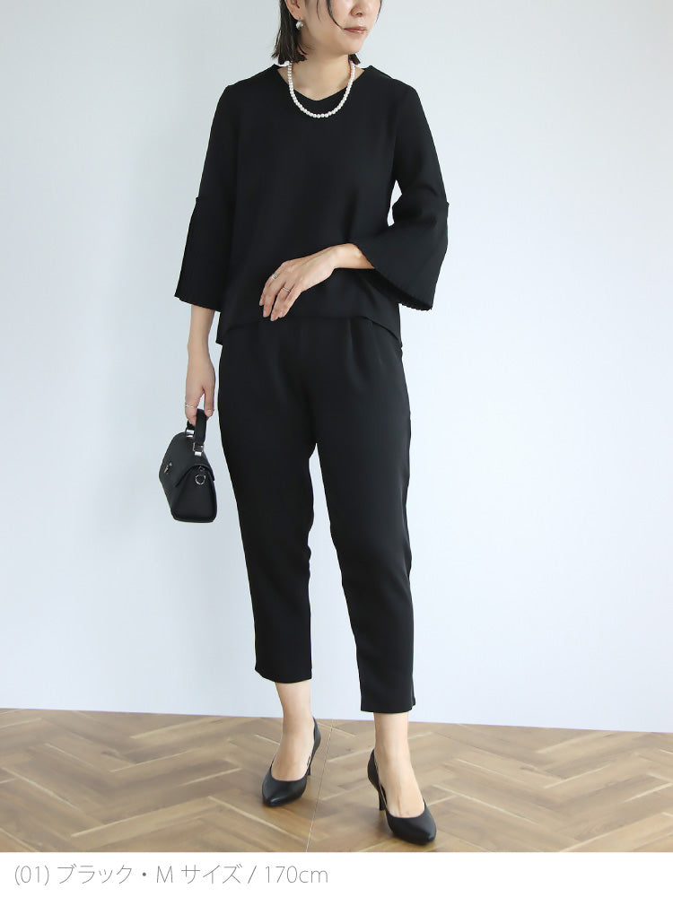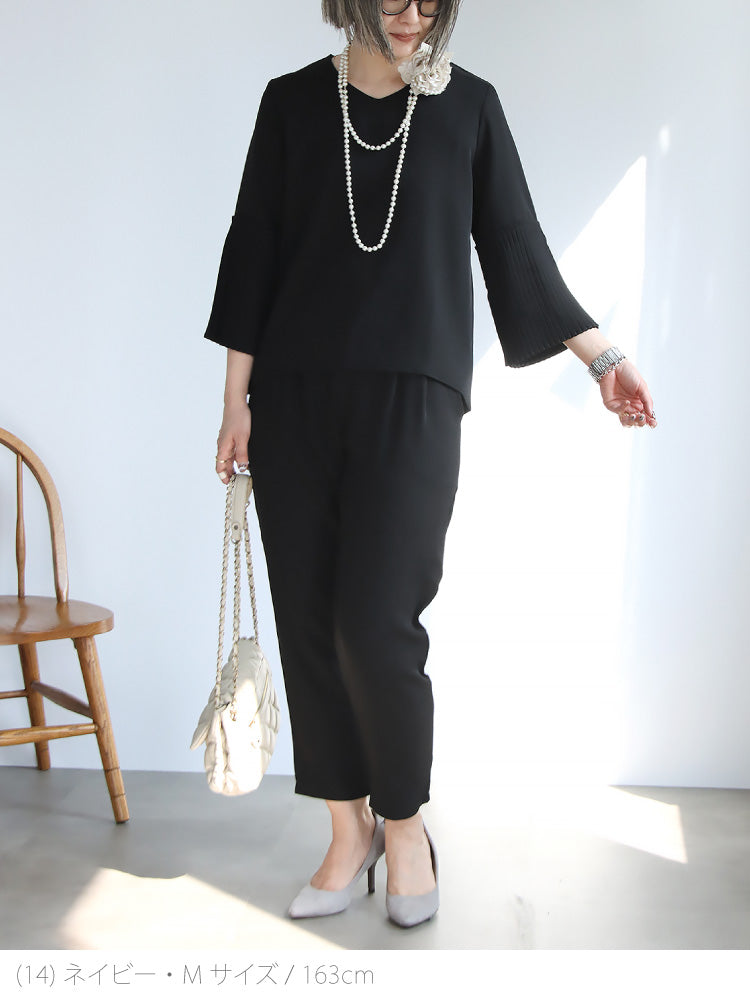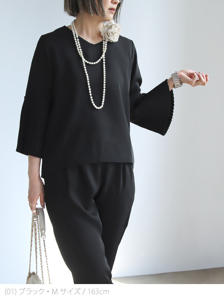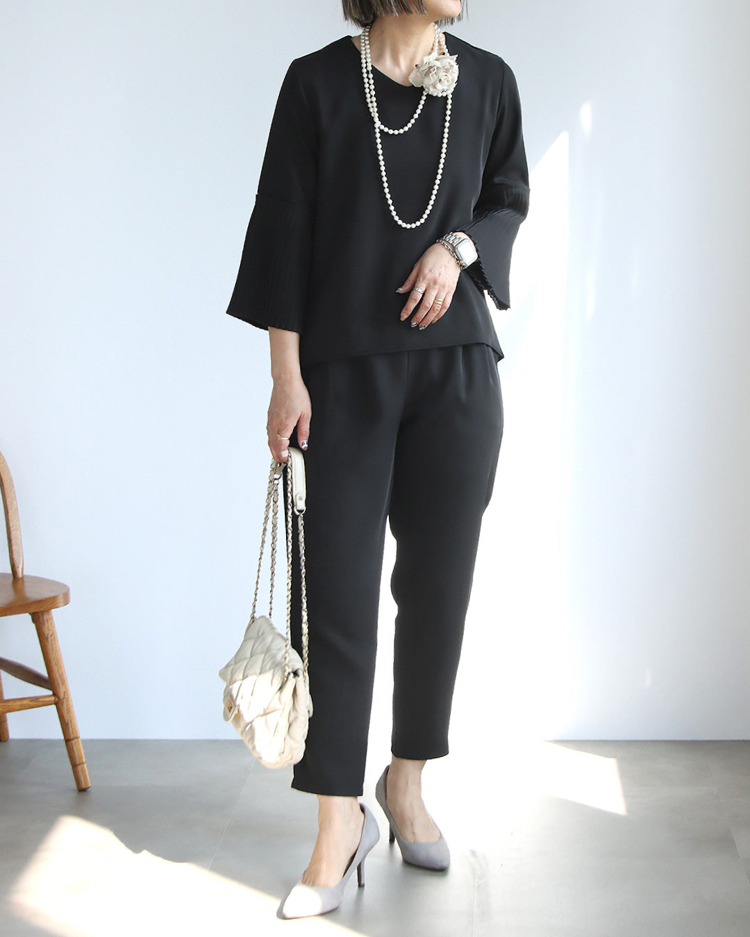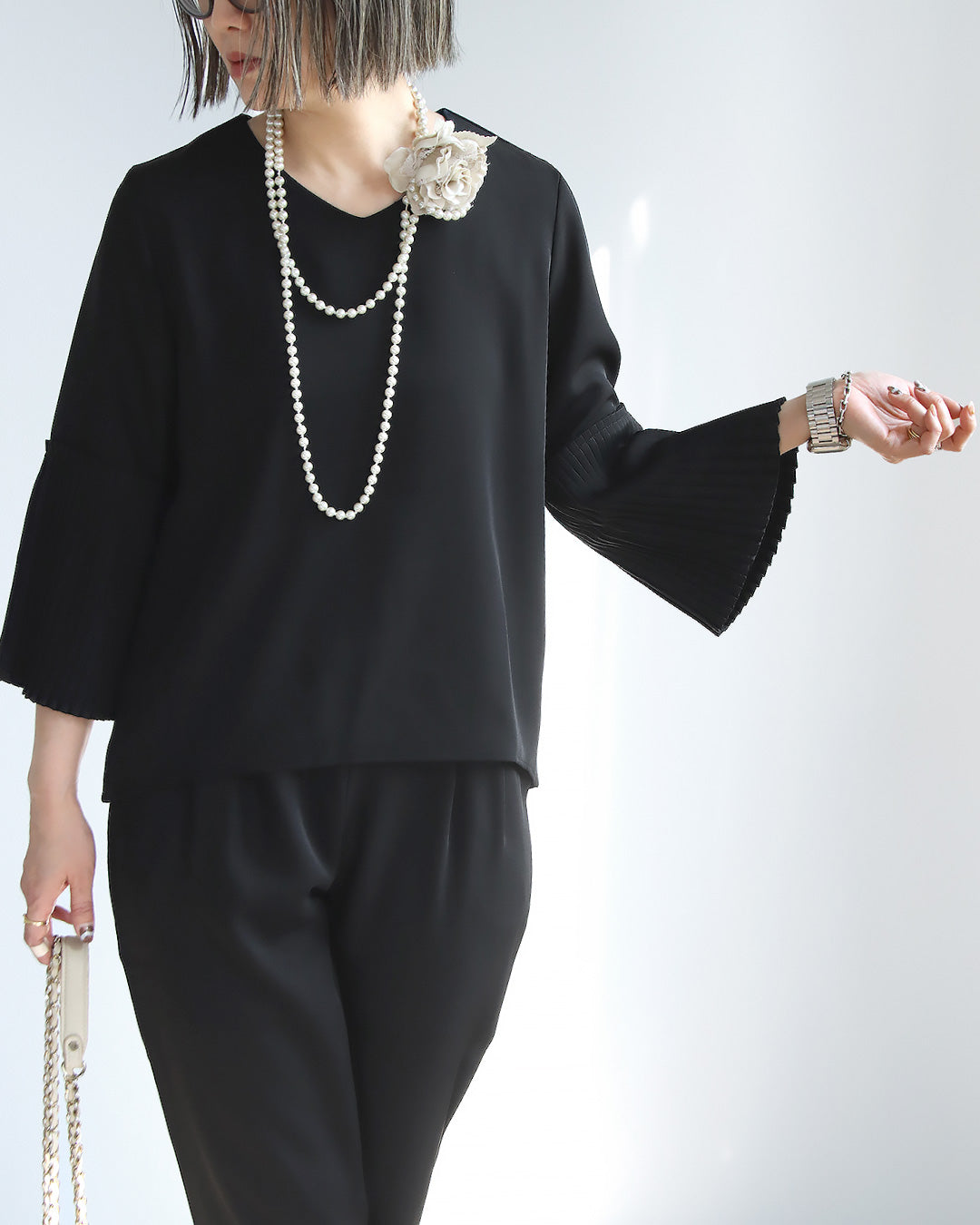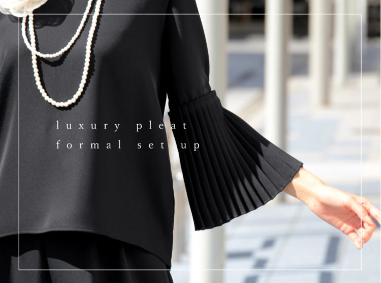 1.上質な光沢感のあるとろみ素材×きちんと感のある細めプリーツで高級感アップ。