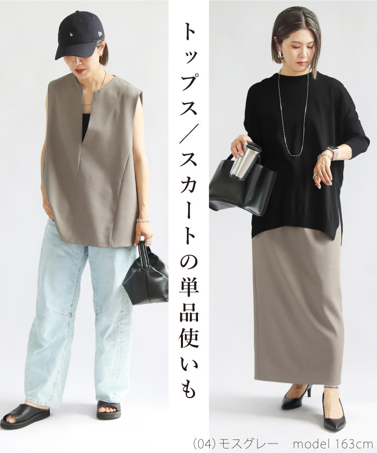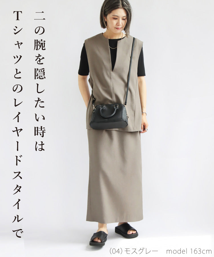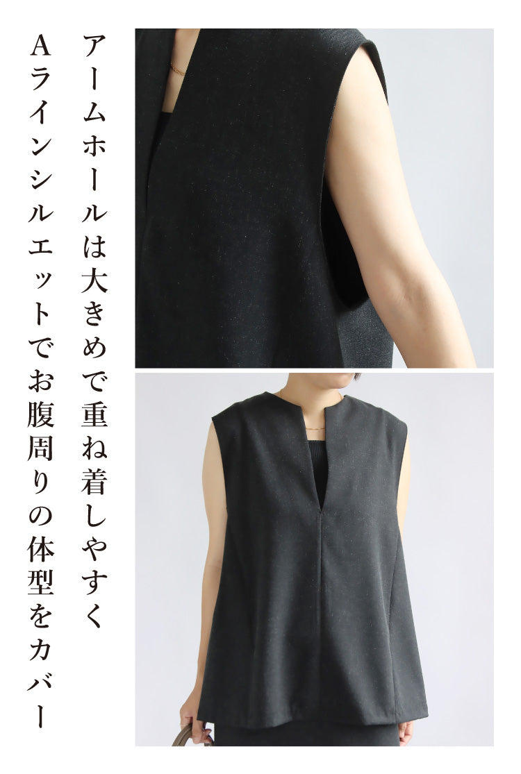 アームホールを大きめにして重ね着しやすく、Aラインシルエットで体型も自然にカバーできます。