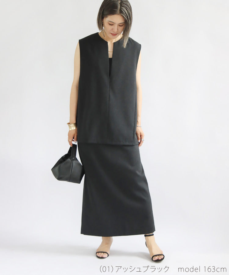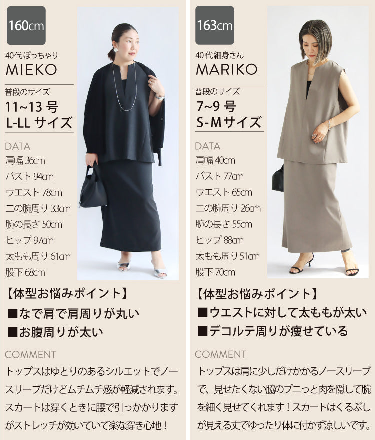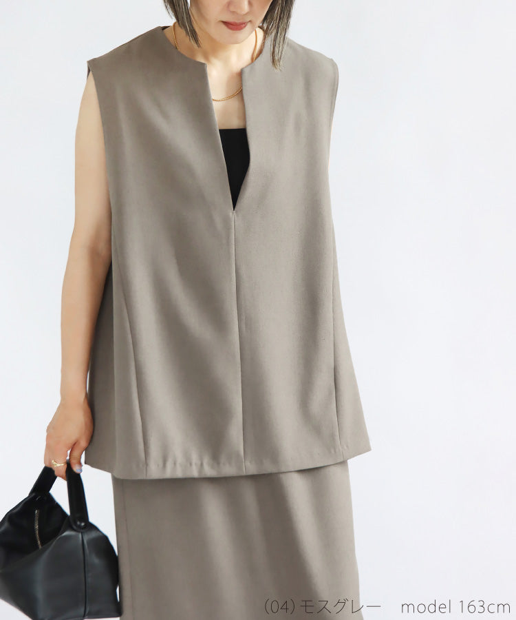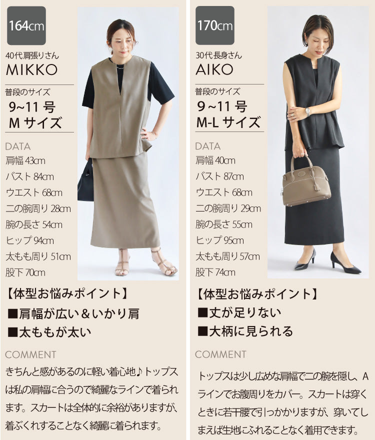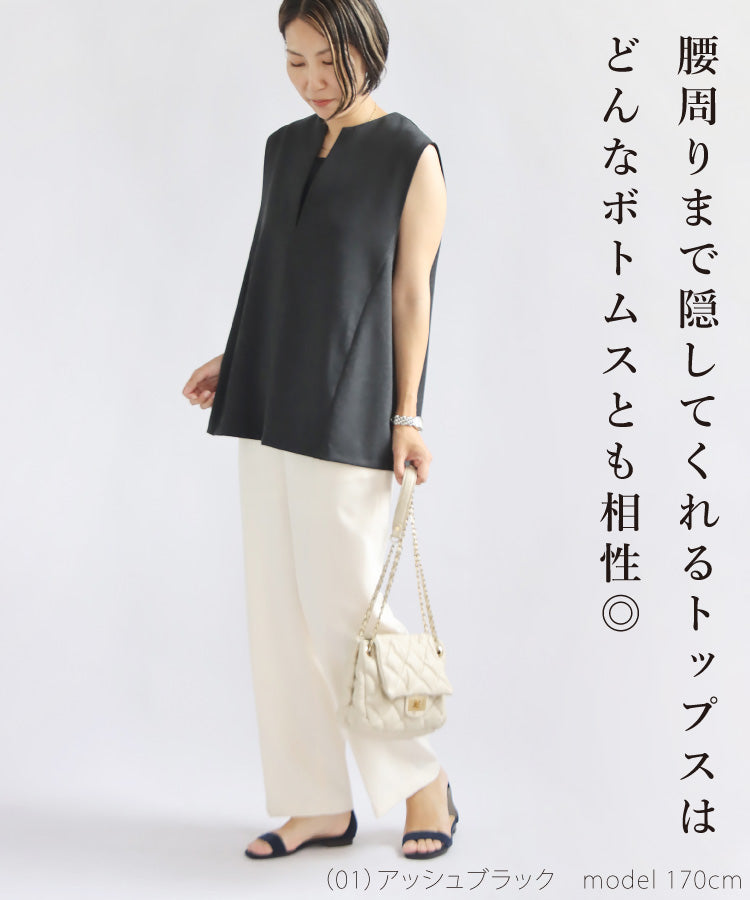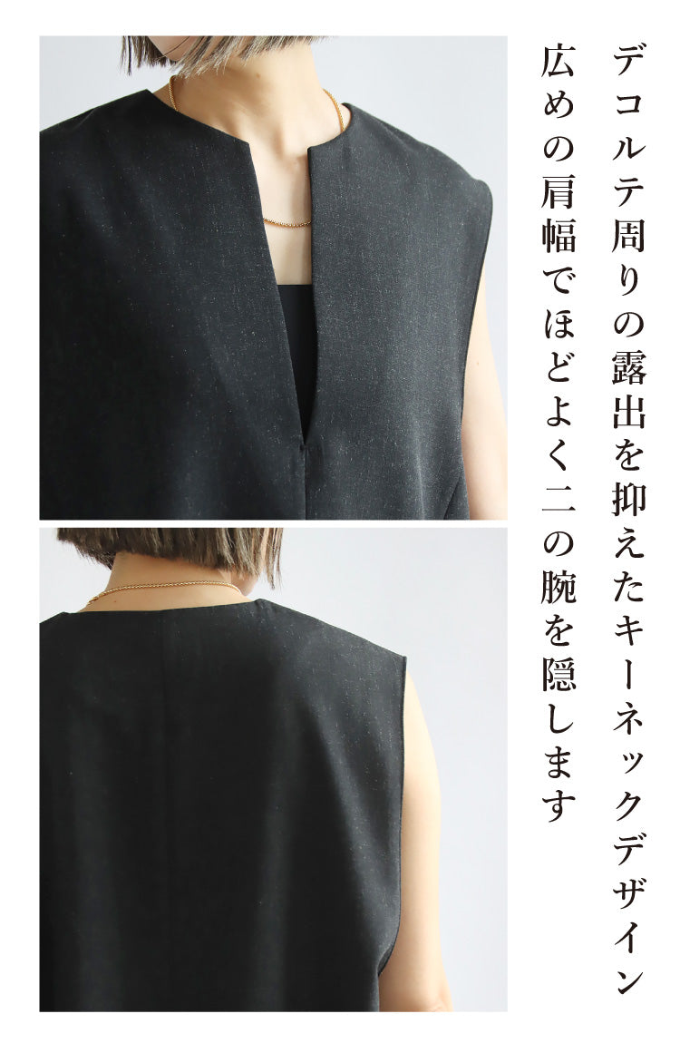 キーネックでデコルテの露出を抑え、肩幅を広めにして二の腕をさりげなくカバー。