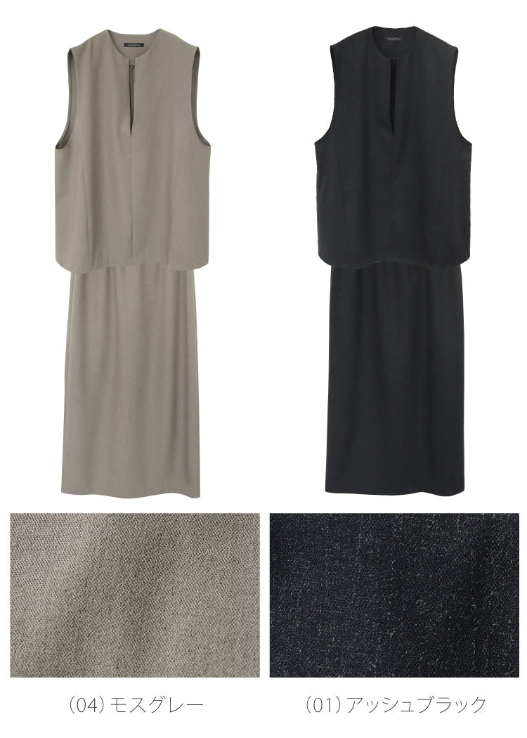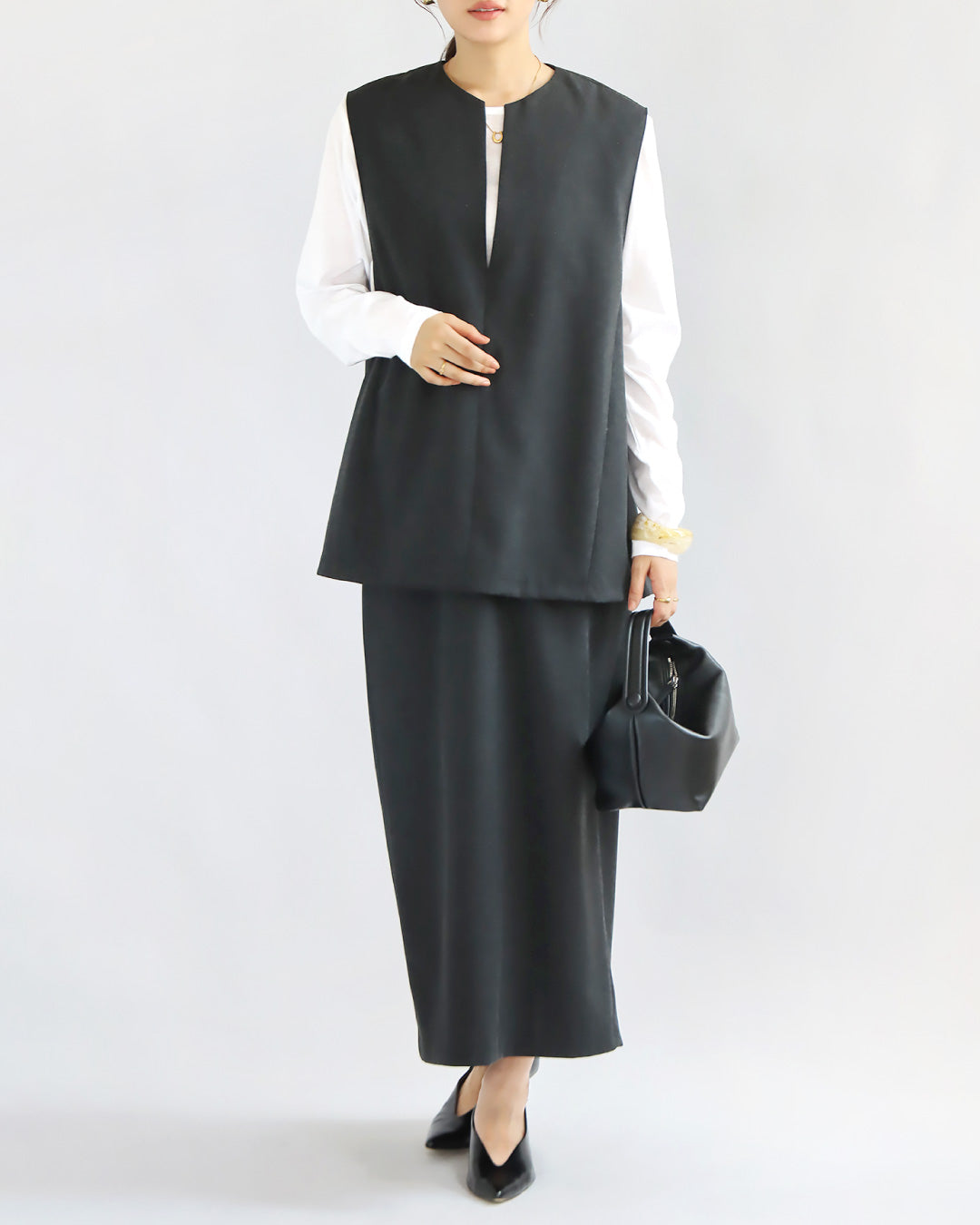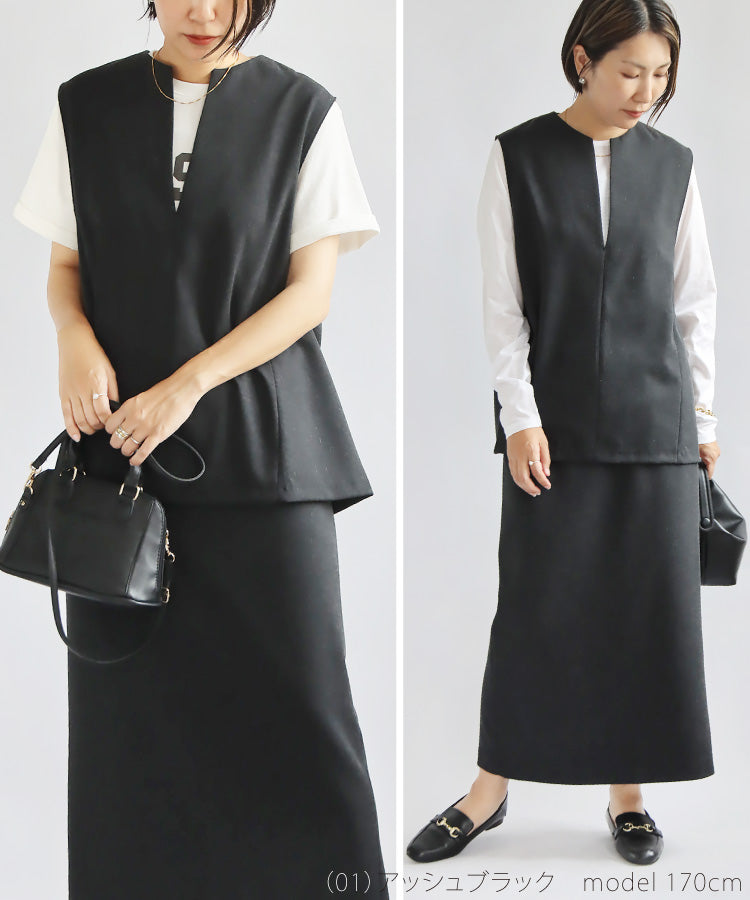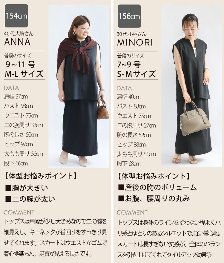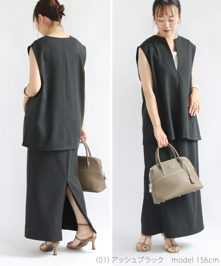 キーネックでデコルテの露出を抑え、肩幅を広めにして二の腕をさりげなくカバー。