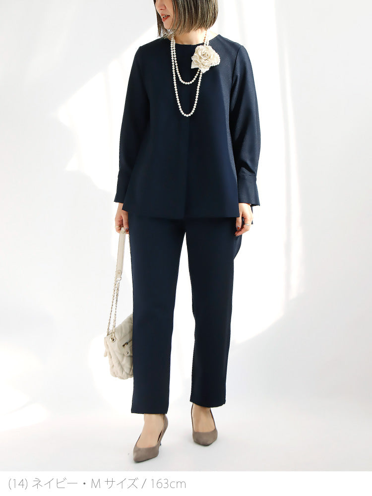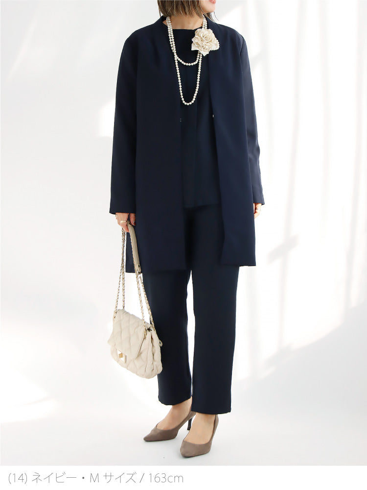 入学式にはロングネックレスとフラワーコサージュで華やかに仕上げて。