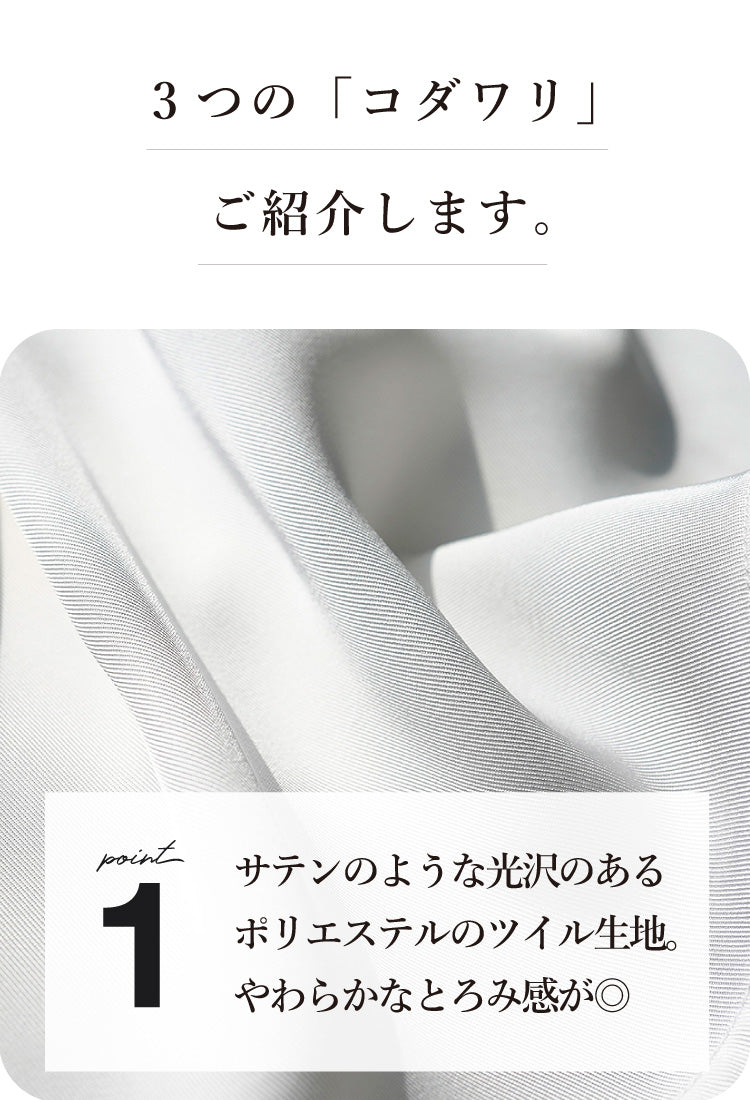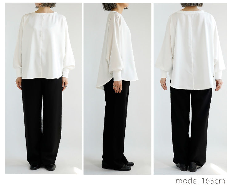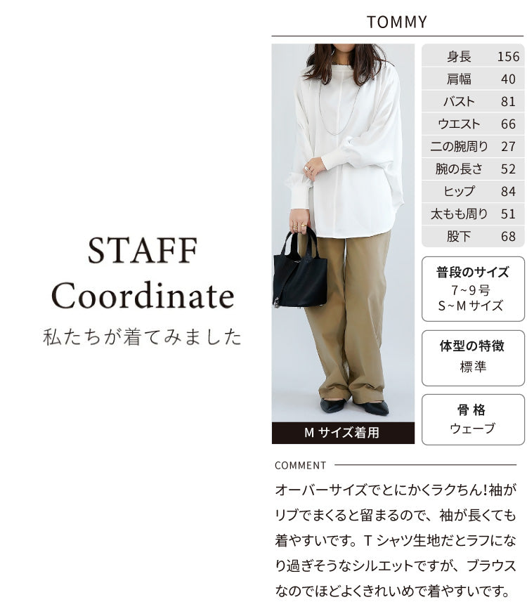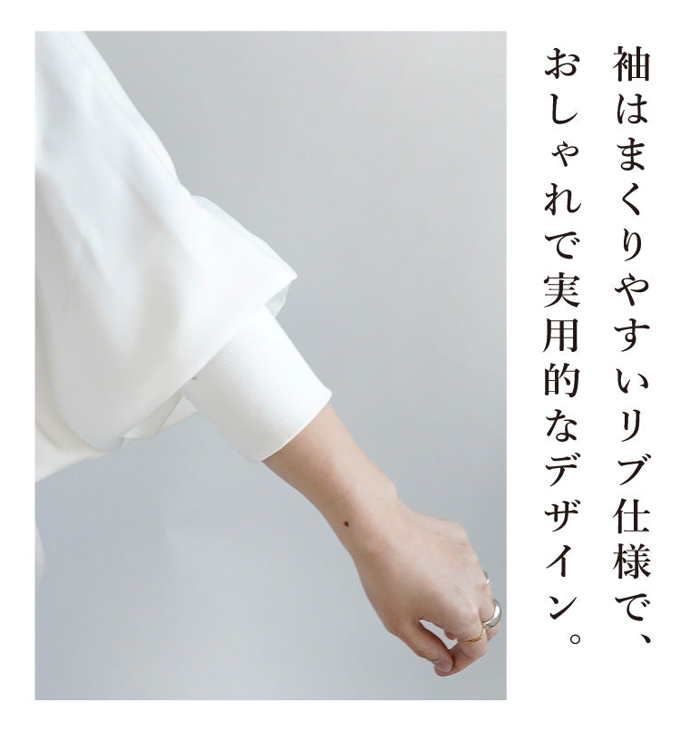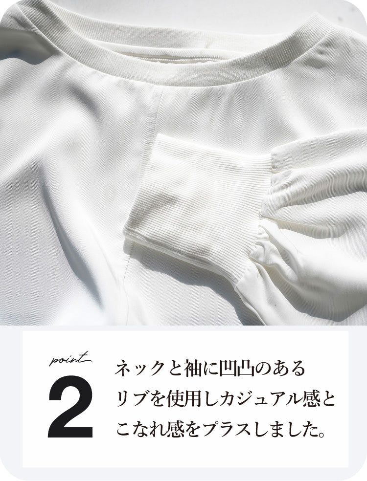 素材にはサテンのような光沢とやわらかなとろみ感のあるポリエステルツイルを使用し、ネックと袖には凹凸のあるリブを施してカジュアル感とこなれ感をプラス。