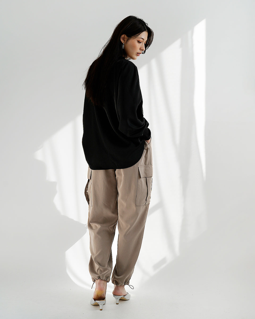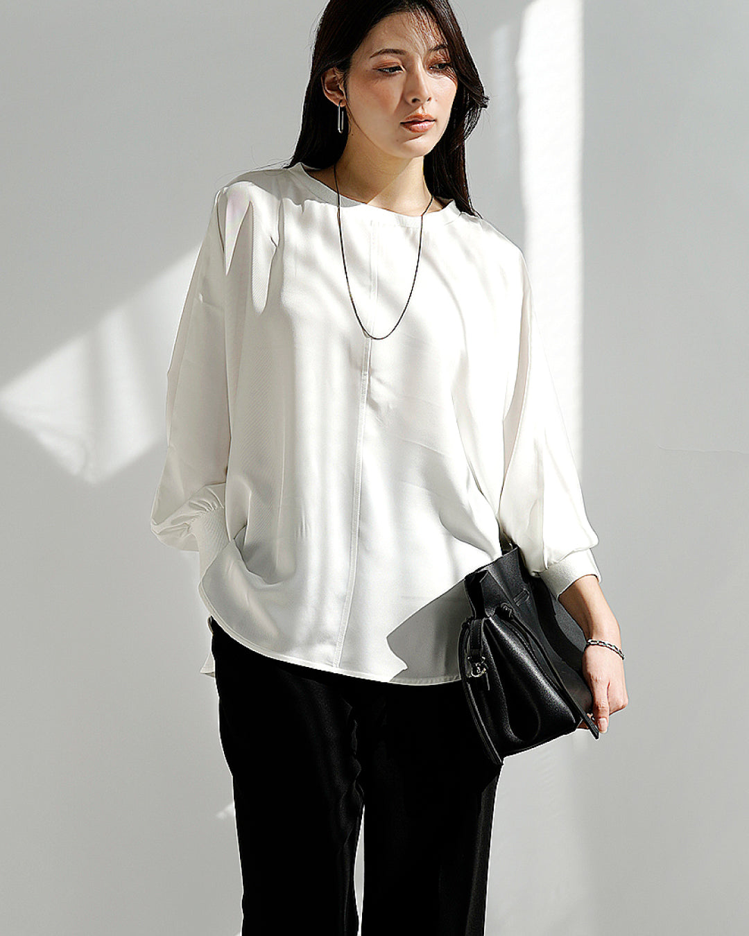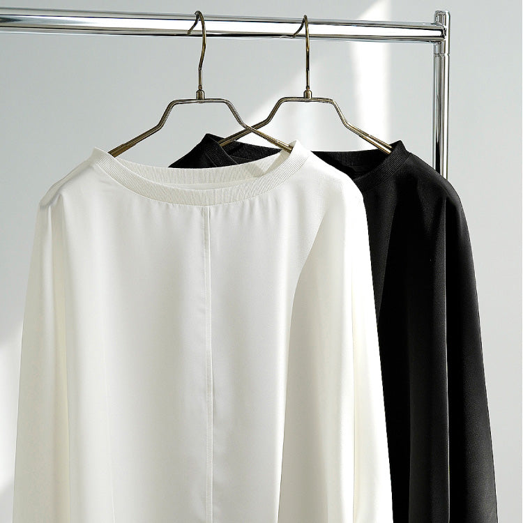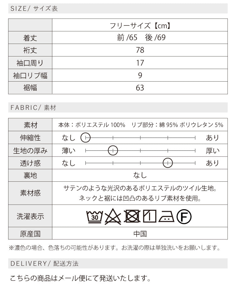 素材にはサテンのような光沢とやわらかなとろみ感のあるポリエステルツイルを使用し、ネックと袖には凹凸のあるリブを施してカジュアル感とこなれ感をプラス。