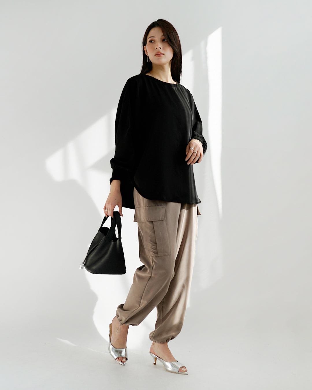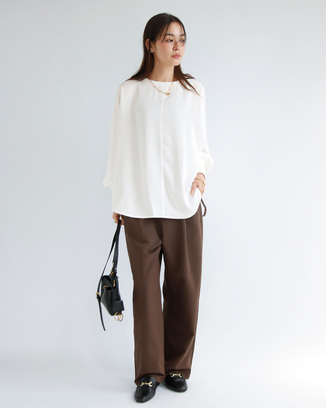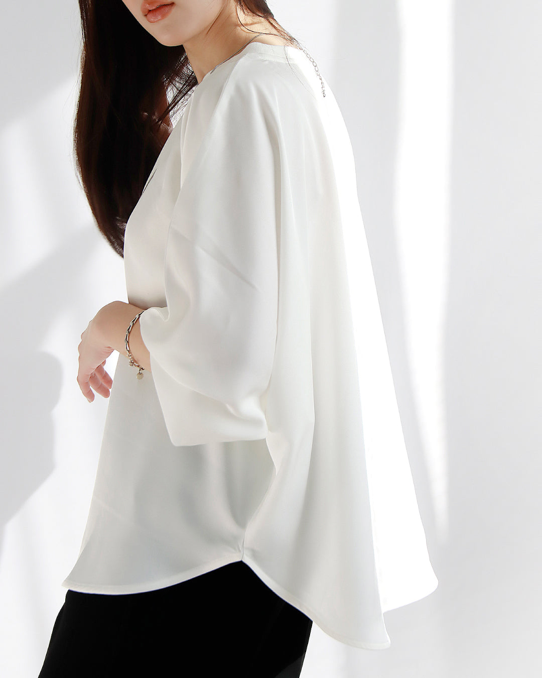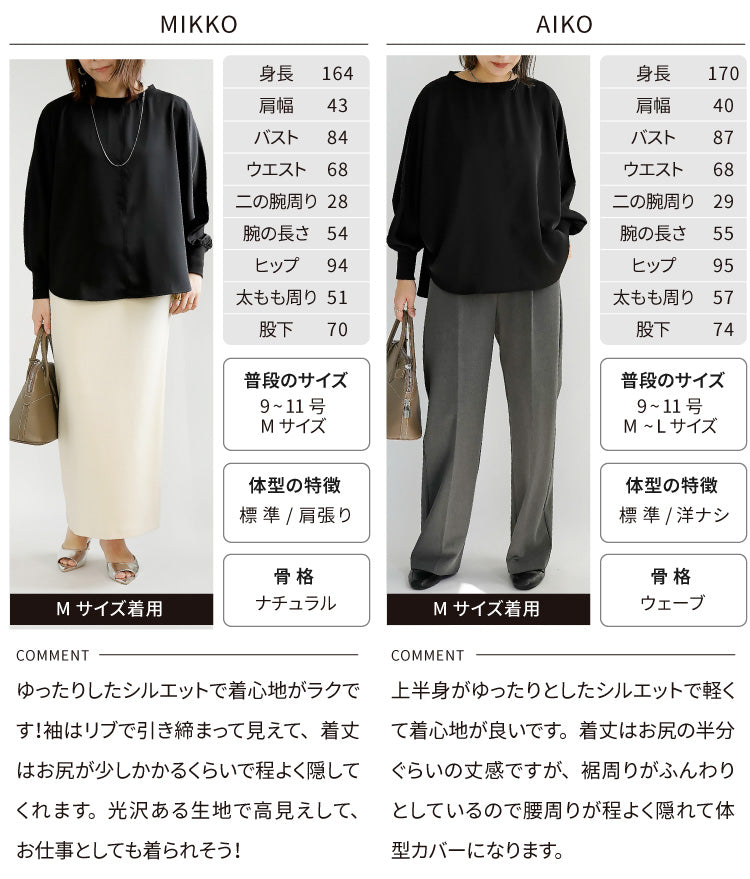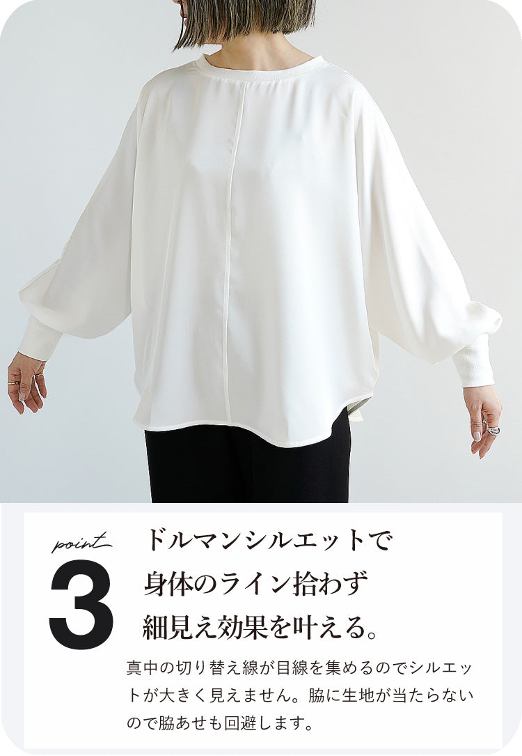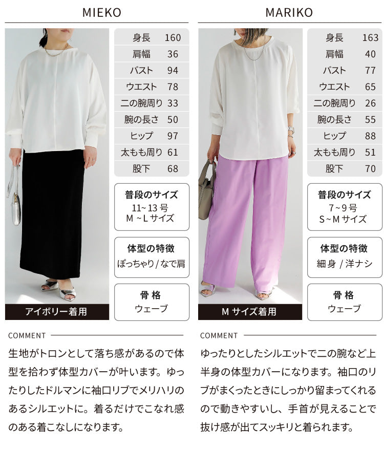 身体のラインを拾わないドルマンシルエットは、自然に生まれる優美なドレープで気になる腰周りをさりげなくカバーし、着痩せとおしゃれを同時に叶えます。