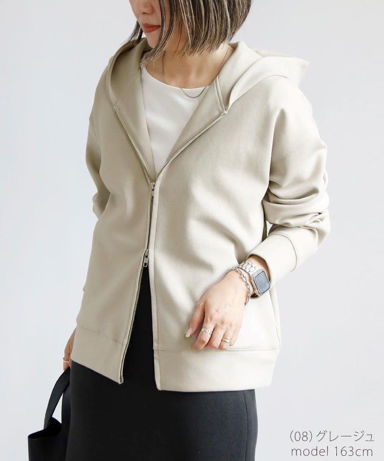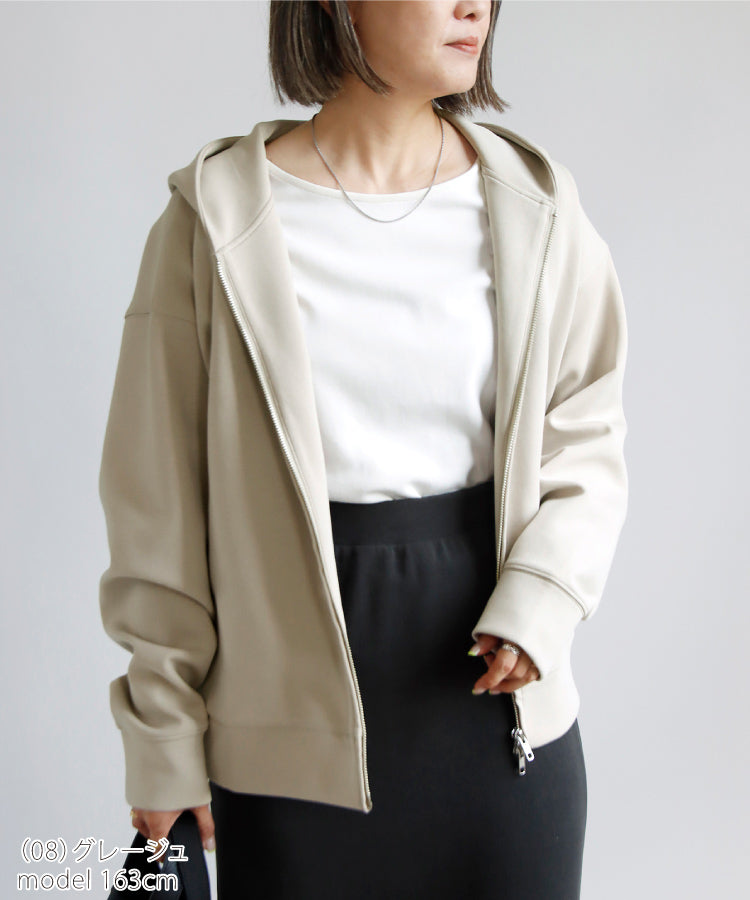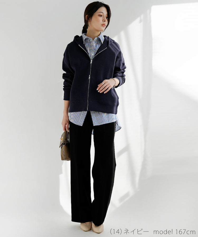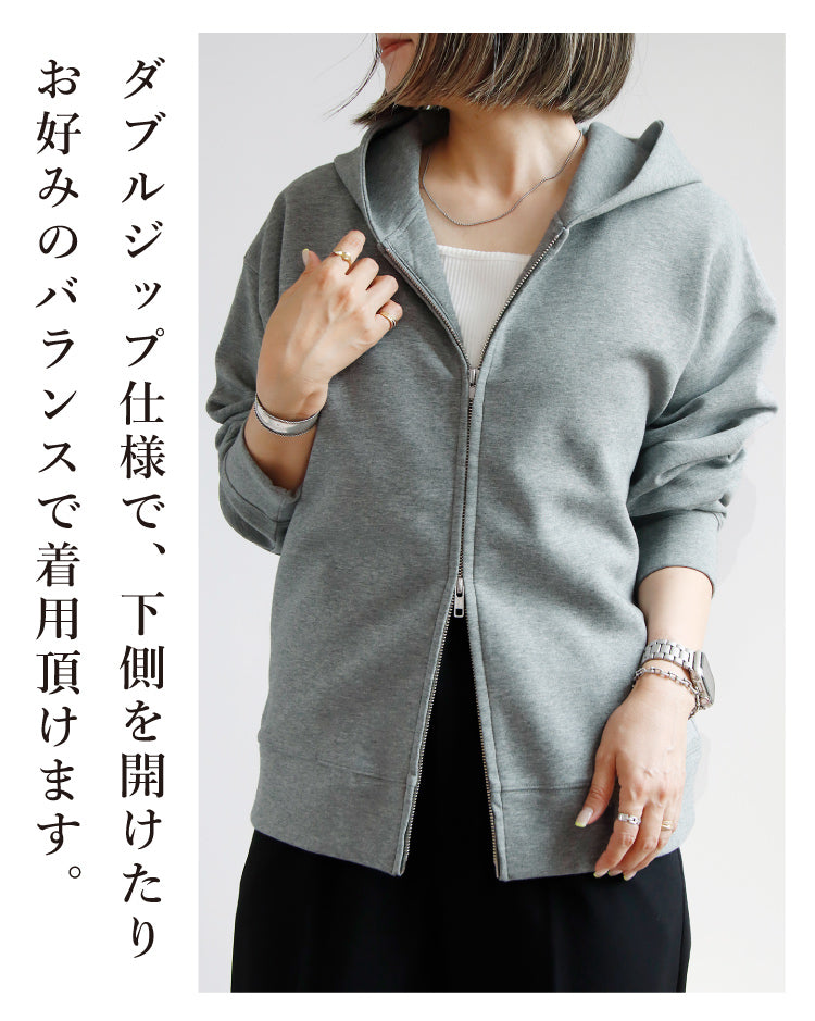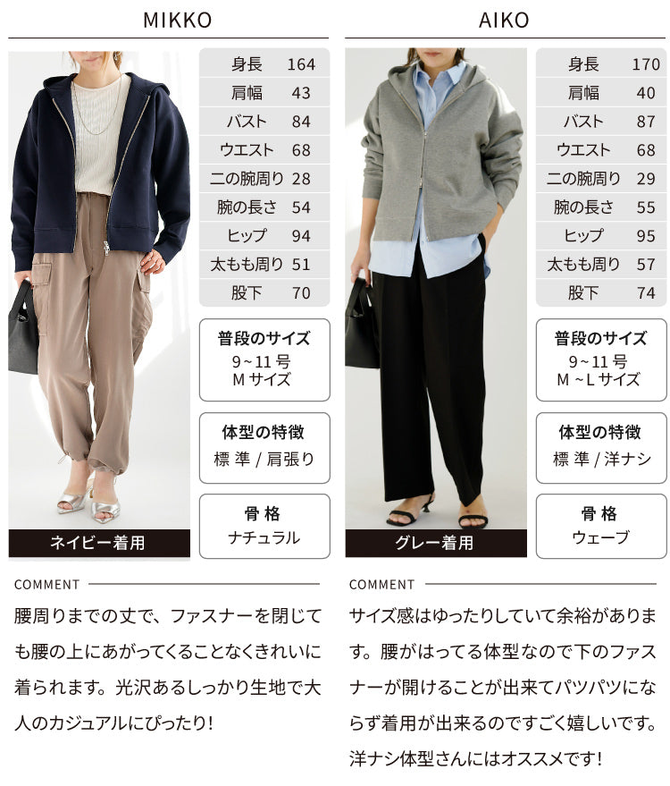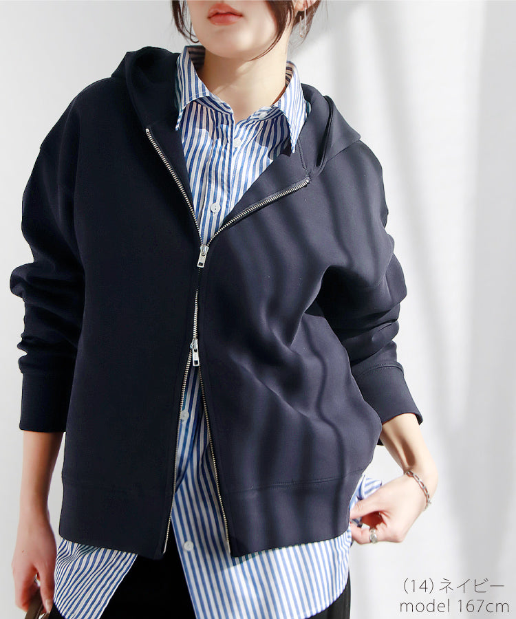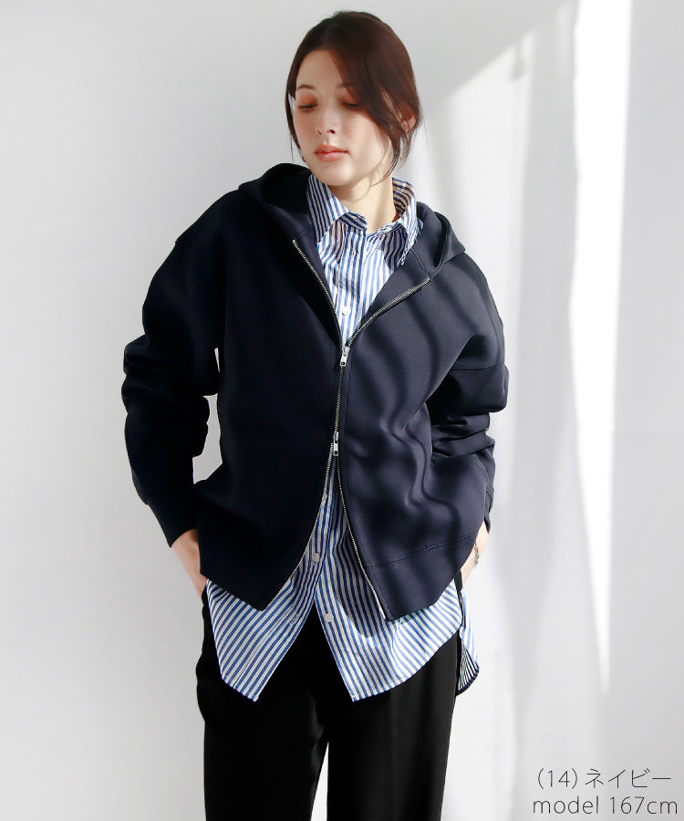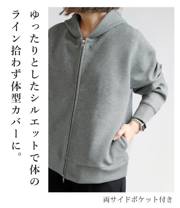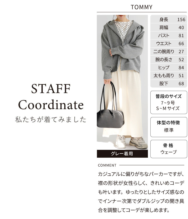 ジップの開き具合が調整でき、ゆるっとしたシルエットなので、シャツなどのレイヤードが楽しめます。