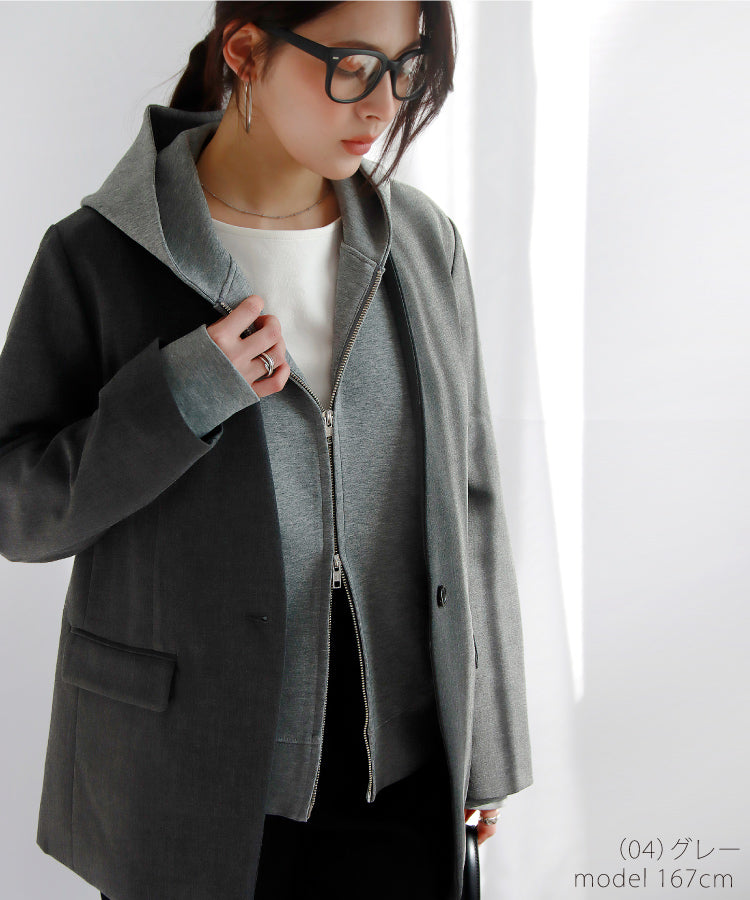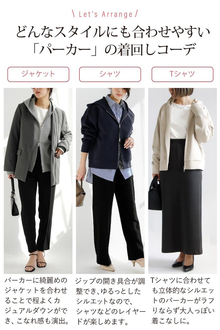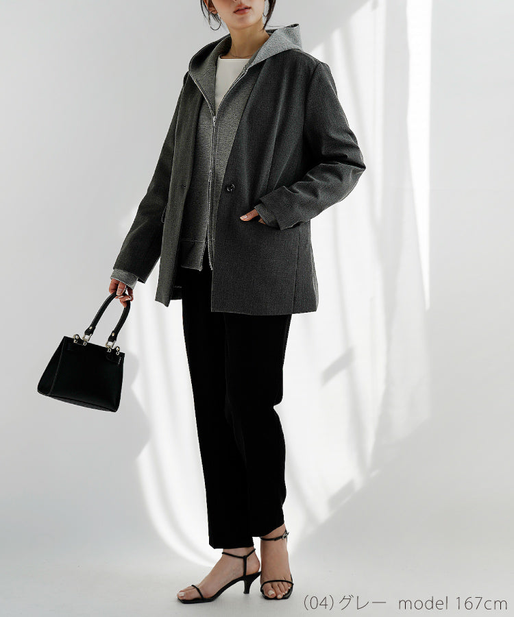 パーカーに綺麗めのジャケットを合わせることで程よくカジュアルダウンができ、こなれ感も演出。