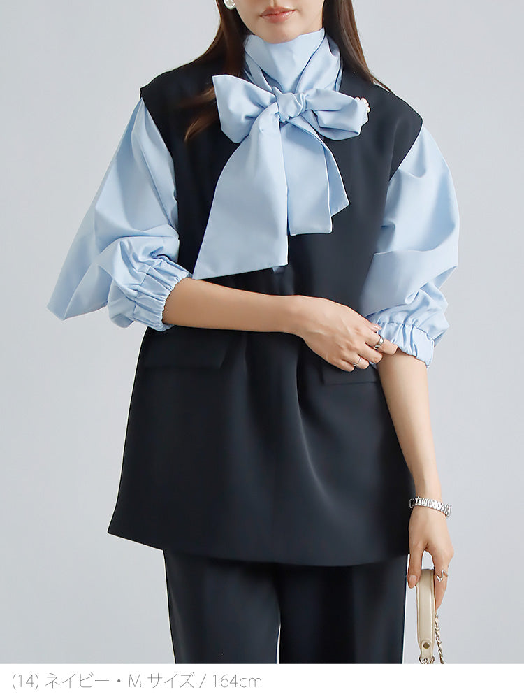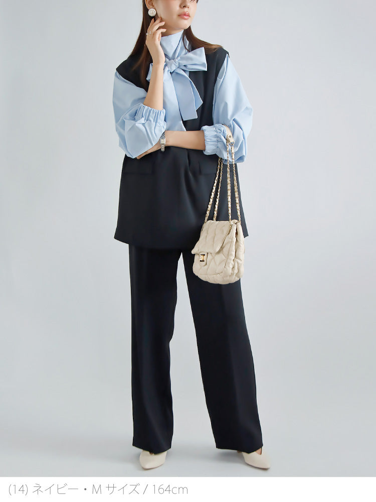 印象的なブルーのボウタイブラウスを主役に。大きめリボンがポイント。