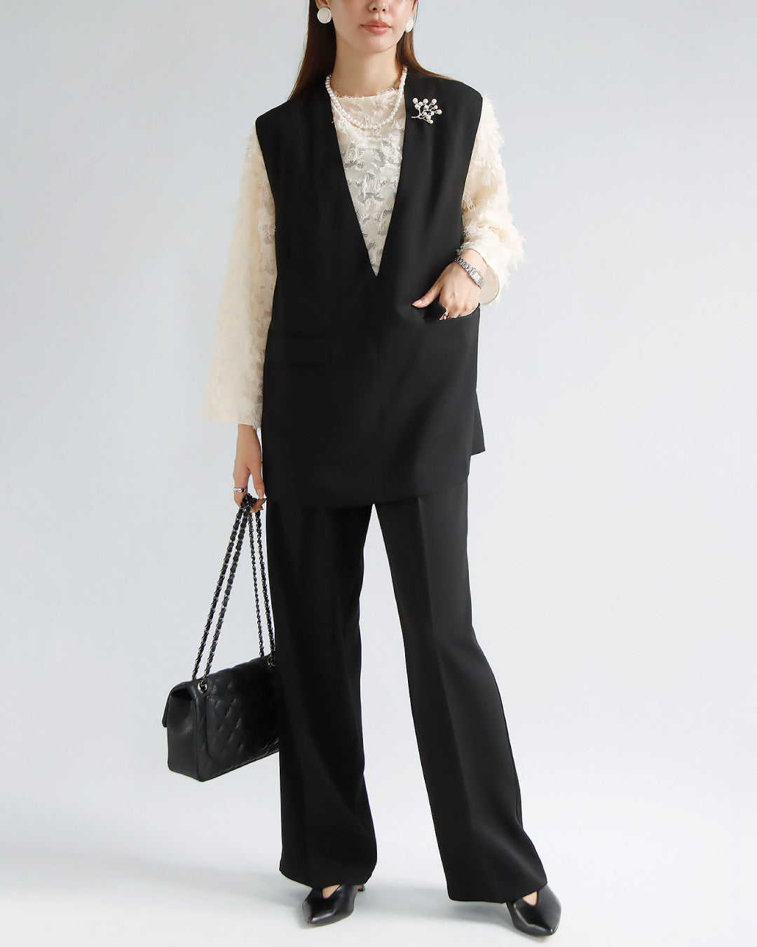 オールブラックコーデにパールとコサージュで華やかさをプラスして。