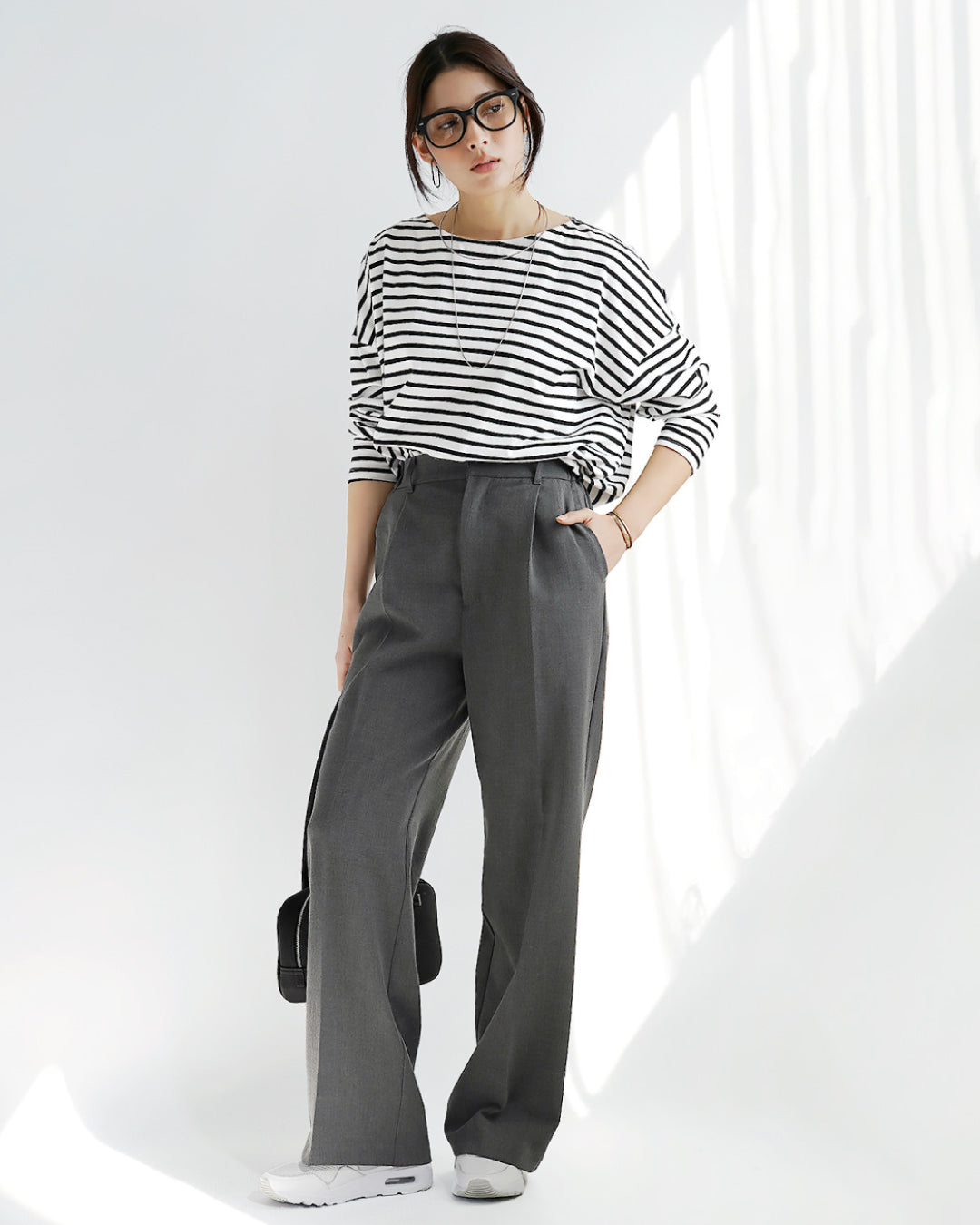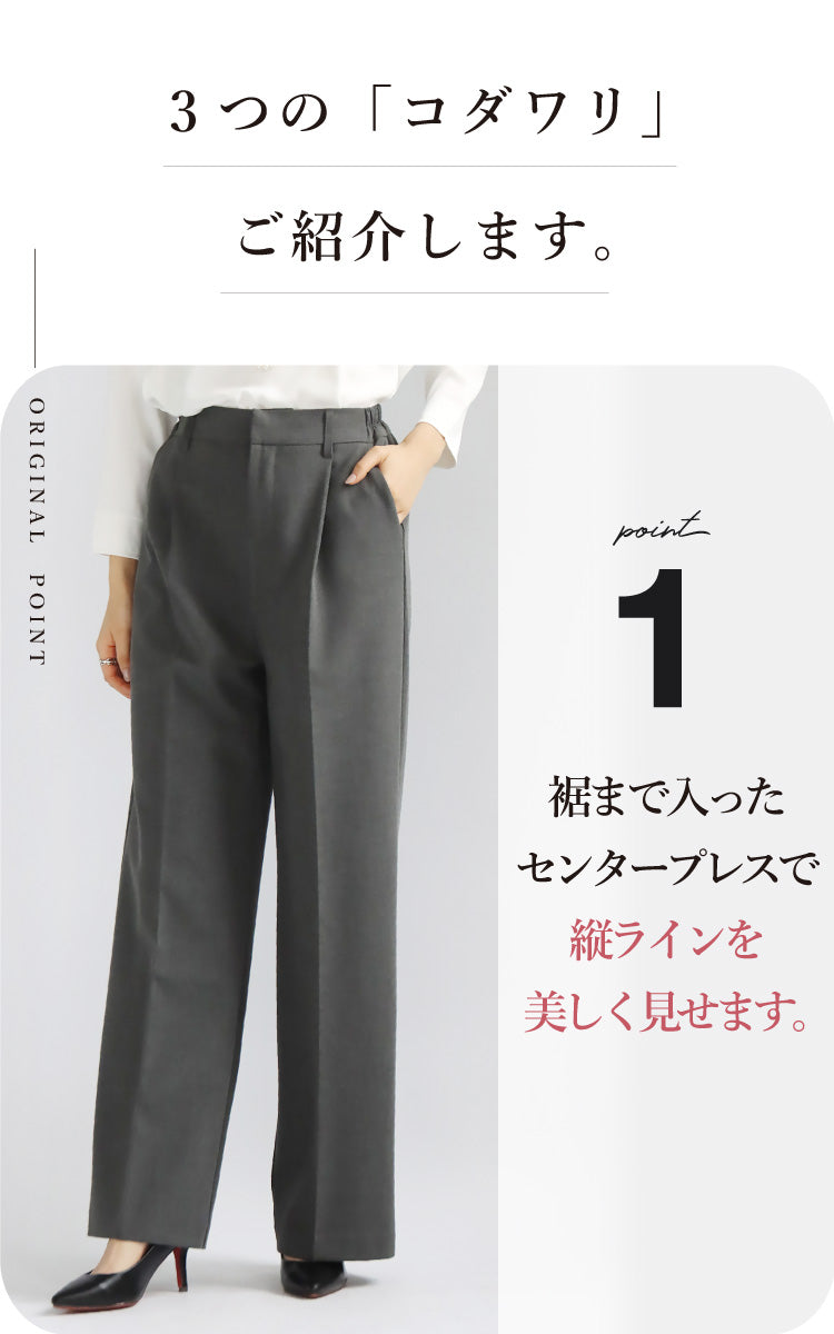 太すぎないワイドシルエットと裾まで入ったセンタープレスで