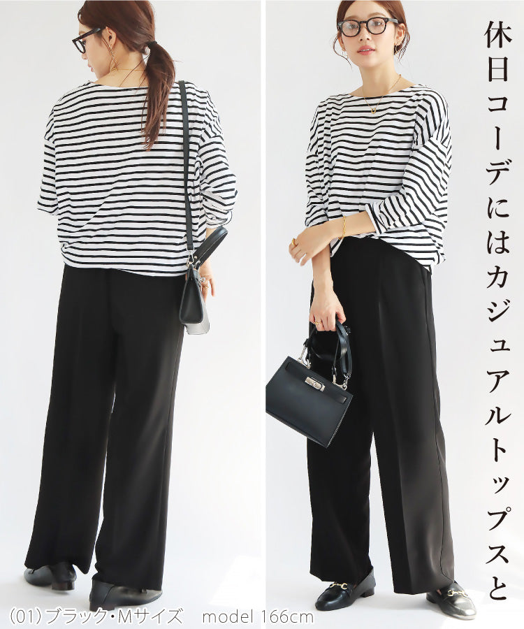 カジュアルなボーダーTもセンタープレス入りパンツを合わせれば崩しすぎない大人のカジュアルコーデに。